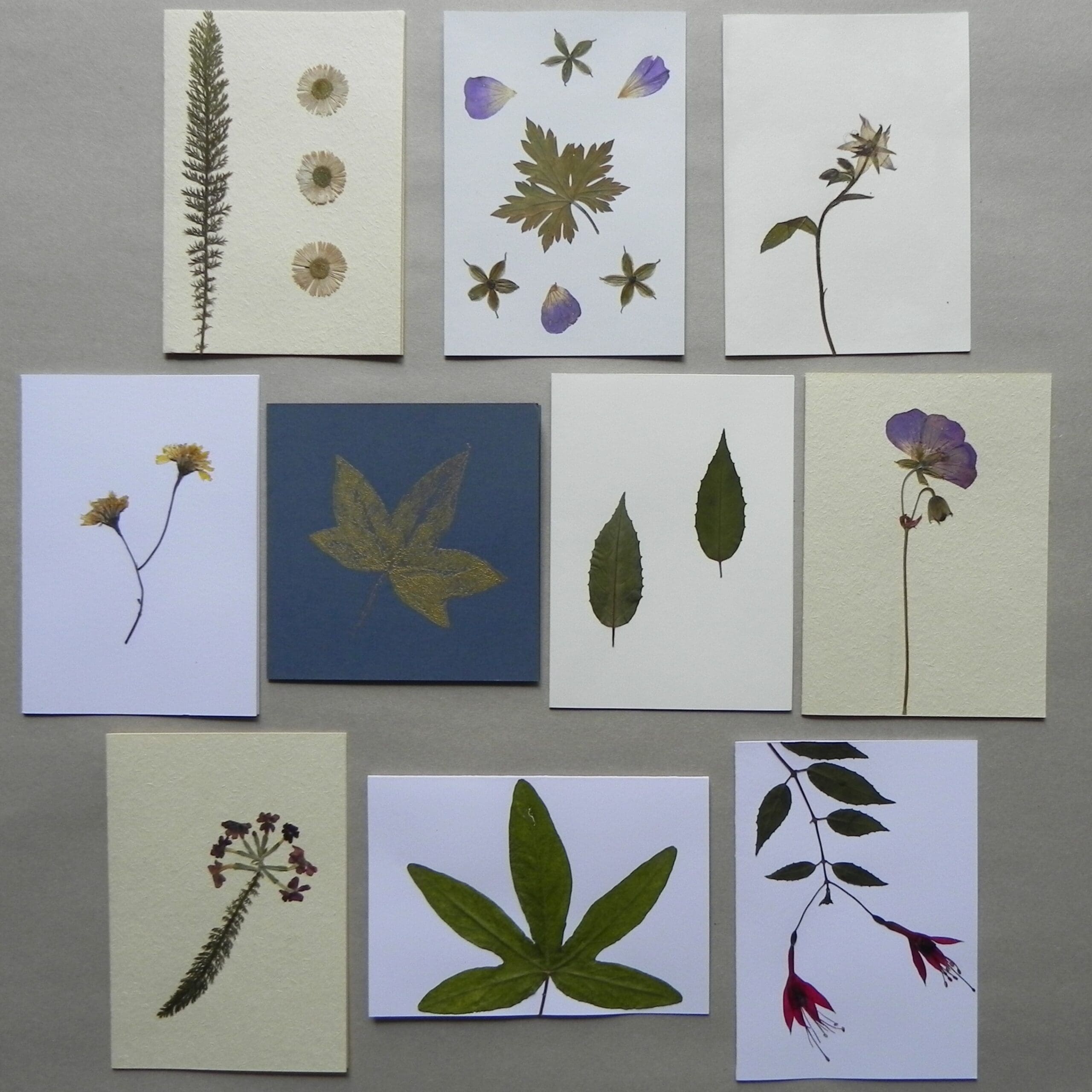 A selection of 10 greeting cards created with care using real, locally-sourced and pressed flowers and leaves. Each design is unique and original.