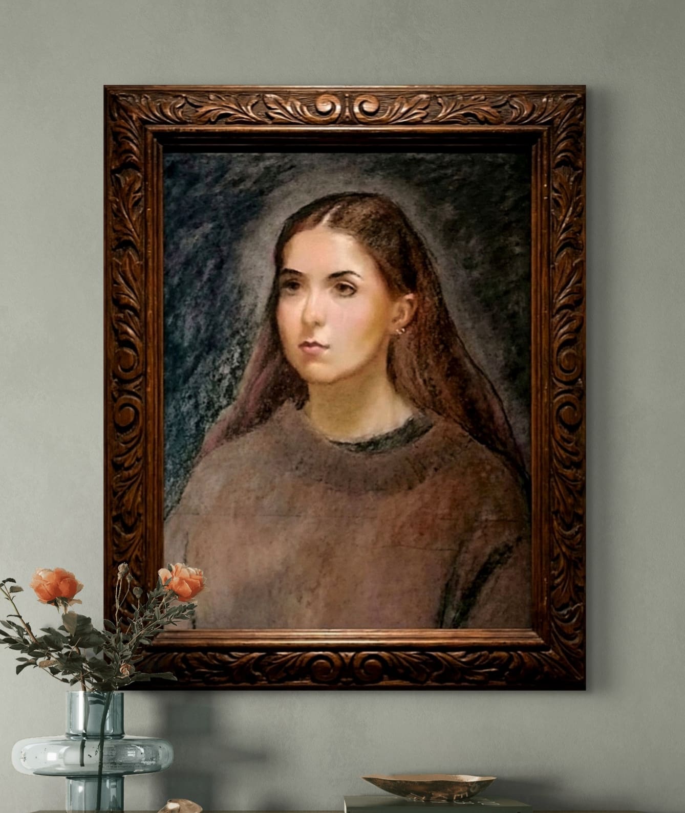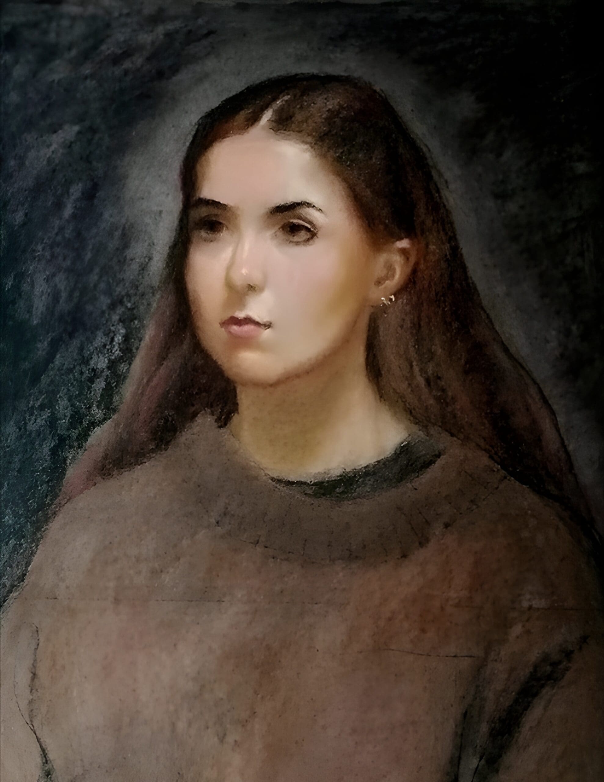 Soft Shadows of a Youthful Moment invites quiet reflection through its gentle and measured portrayal of a young woman caught in a moment of stillness. The soft earthy tones and muted palette create a natural harmony that feels both honest and understated, allowing subtle shifts in light and shadow to reveal the contours of her calm expression and relaxed posture. The downward gaze suggests a reflective inner world, one that remains just beyond immediate reach but deeply present. Against a dark, textured backdrop, the figure is thoughtfully isolated, emphasizing the contemplative mood and the delicate balance between presence and solitude. Rendered in Conte chalk, the careful blending and soft transitions lend a tactile warmth to the piece, honoring the quiet dignity of this fleeting encounter.