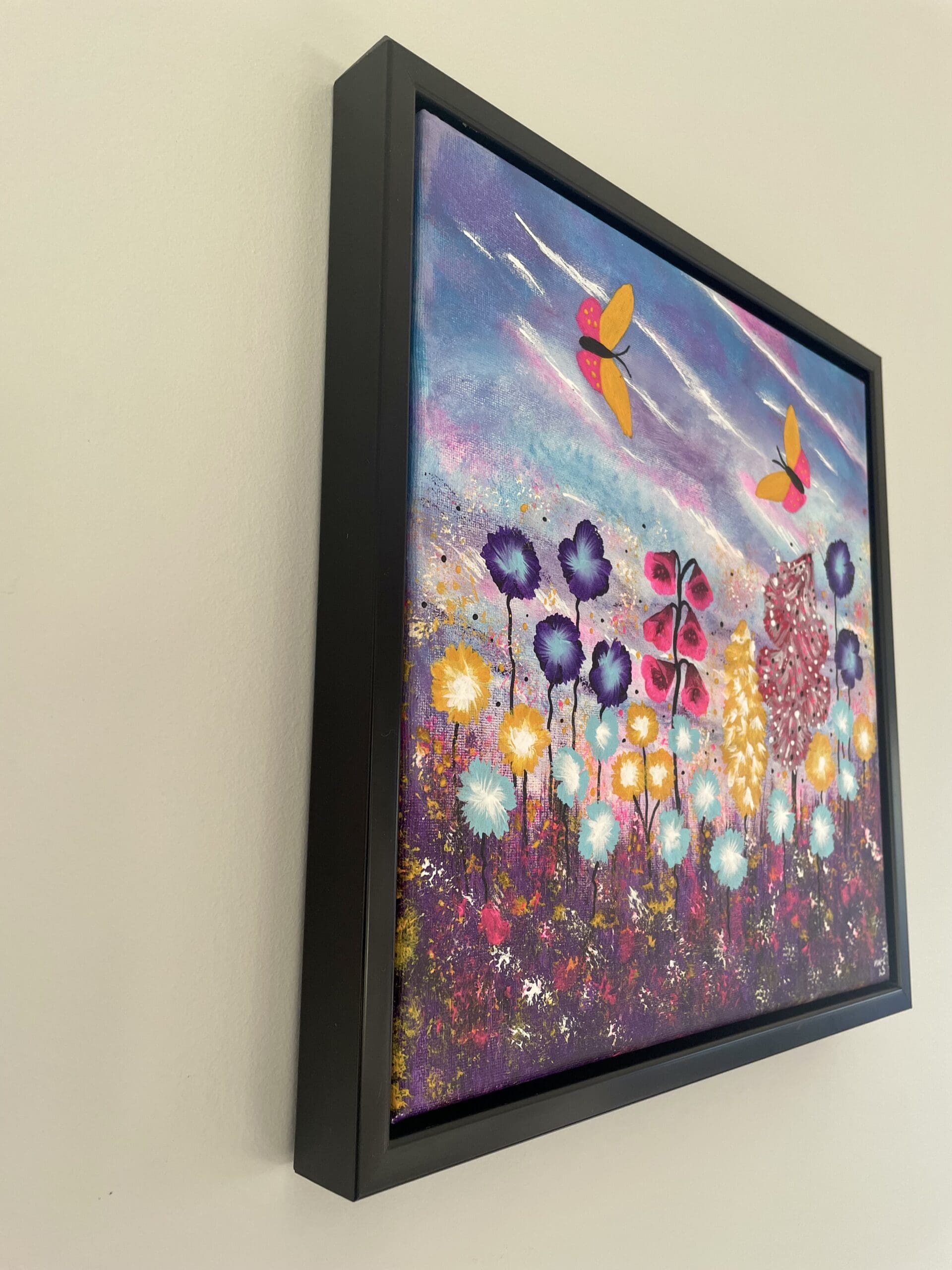 A vivid celebration of nature with colourful blooms and fluttering butterflies against a dreamy sky.