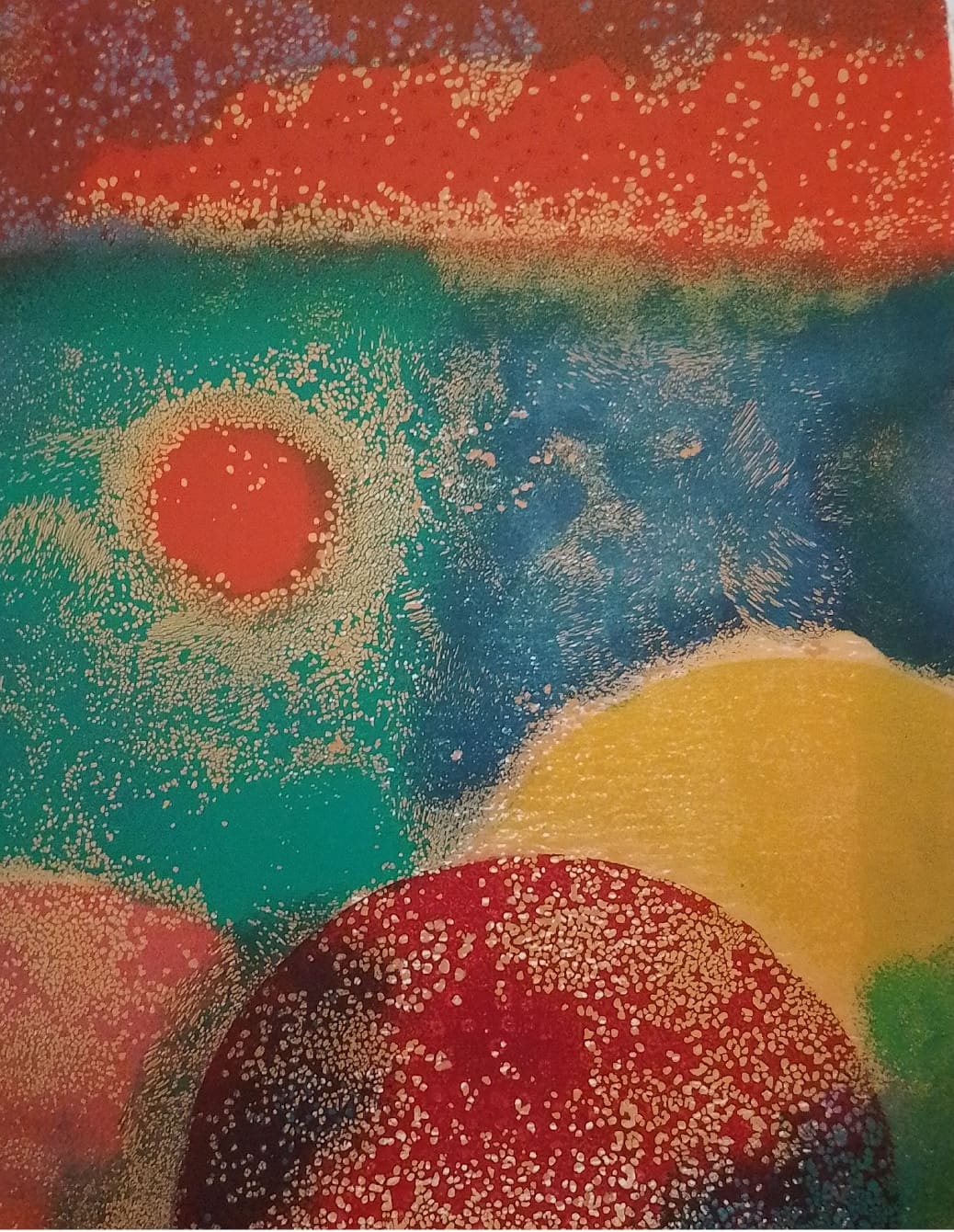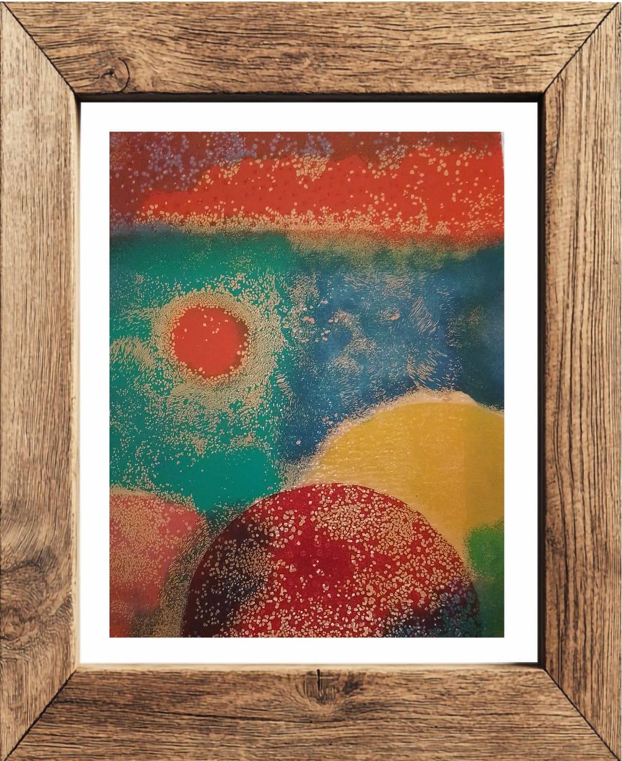 Using strong red and orange hues at the top and bottom of the picture, with calmer tones of blue in the middle, this piece depicts the pressures that squeeze and threaten to unravel our sense of self and the struggle to hold onto the essence that makes us sparkle. The image is 8″ x 10″ inches with a small border to allow for framing. Frame is for illustration only and the print ships unframed.
