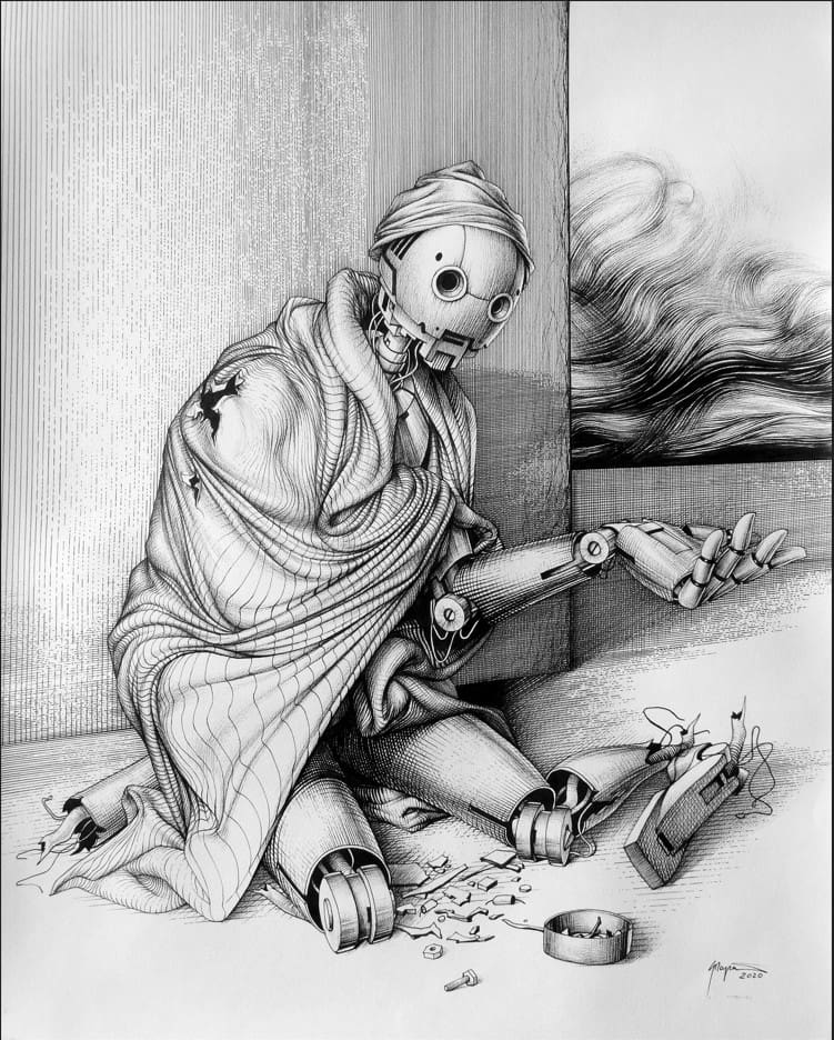 Regardless of the mediu he chooses, easel graphics or digital, the technique only articulates or enhances the message, without altering the content. The corpus of his creation is not only the result of imagination, but of interpretation in the current data of civilization, in which good, beauty, feelings, coexist to merge with inequity, helplessness, pettiness, generating a unitary whole that acts like a radiography of the human. The fantastic lives in a perfect fusion with the real, in which the tentacles of the imagination continue those of reality, floating in times not yet physically consolidated, acting through forces that seem to lurk compromising the vulnerability of reality, opening a gap in time and man (“Surrogate ”,“ Flight in cage ”).