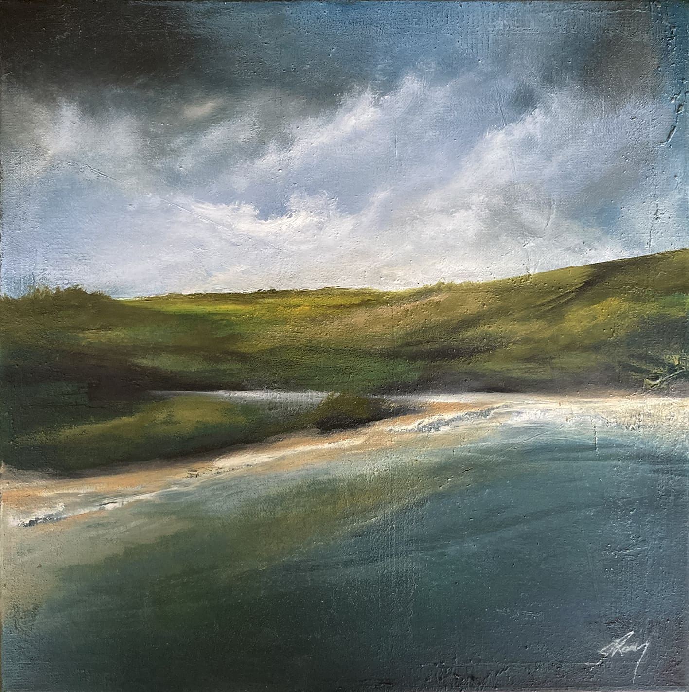 Peaceful, textured painting depicting a deserted bay in West Cork. Oil, sand and cold wax on canvas. Unframed, canvas edges are painted black and the piece is ready to hang.