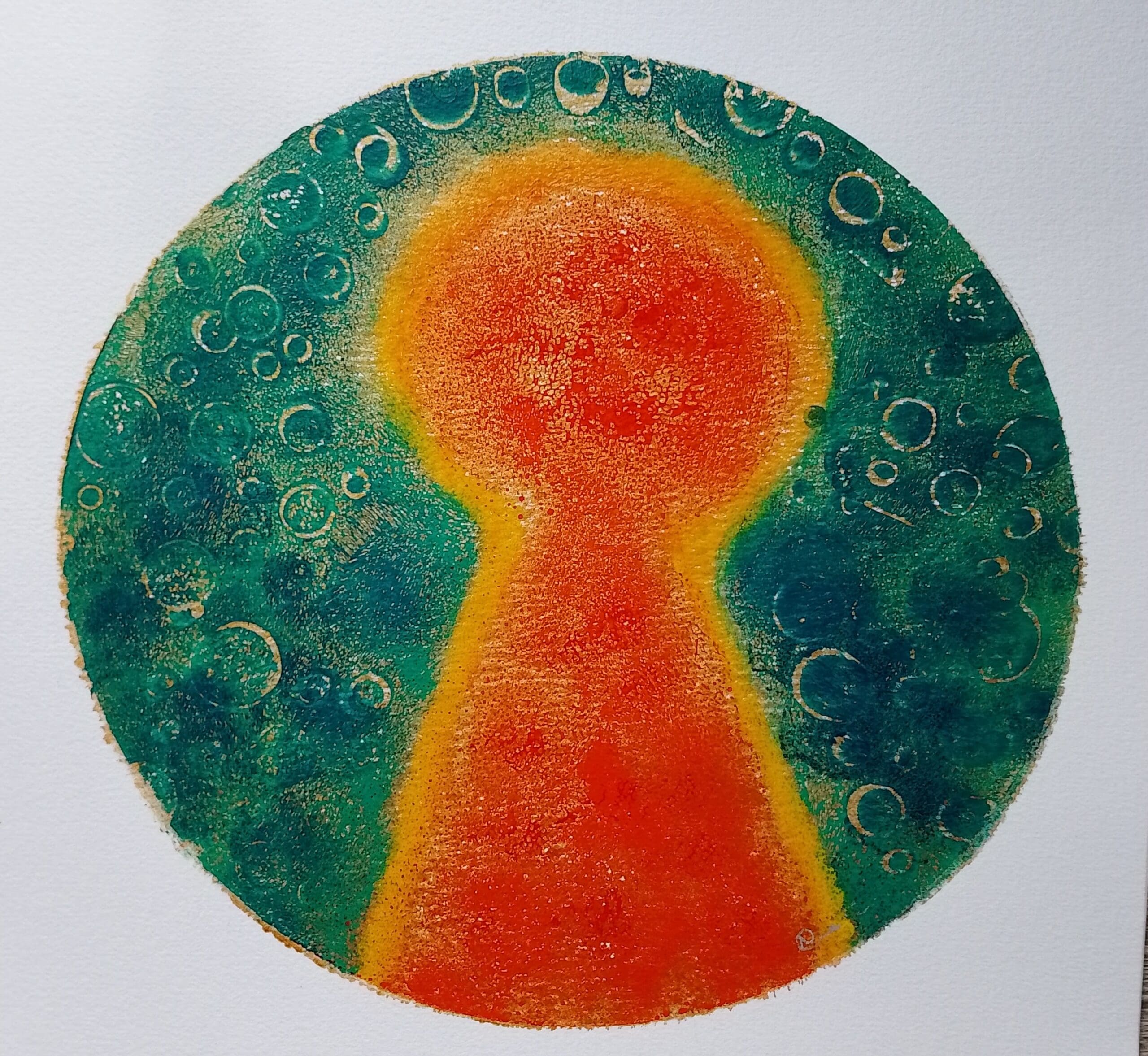 Warm and inviting light, promising of better tomorrows. Part of a series that imagine Alternative Earths, new distant planets offering refuge to weary travellers.Golden metallic glow adds warmth to the colour scheme. Acrylic on paper.
