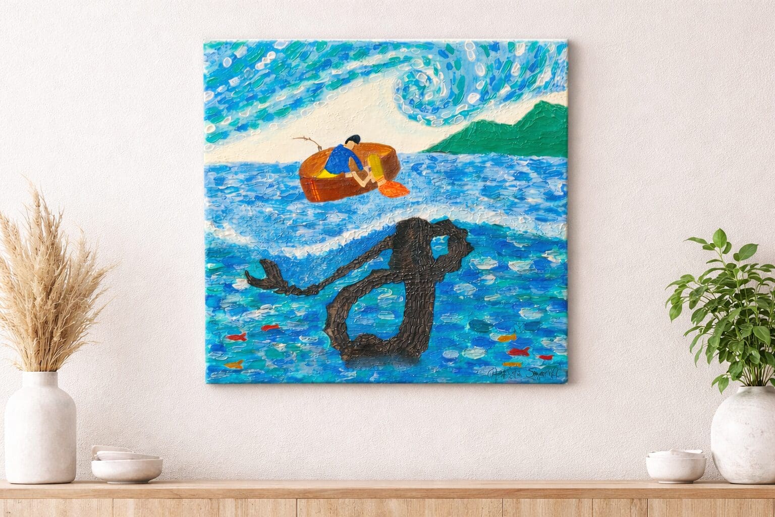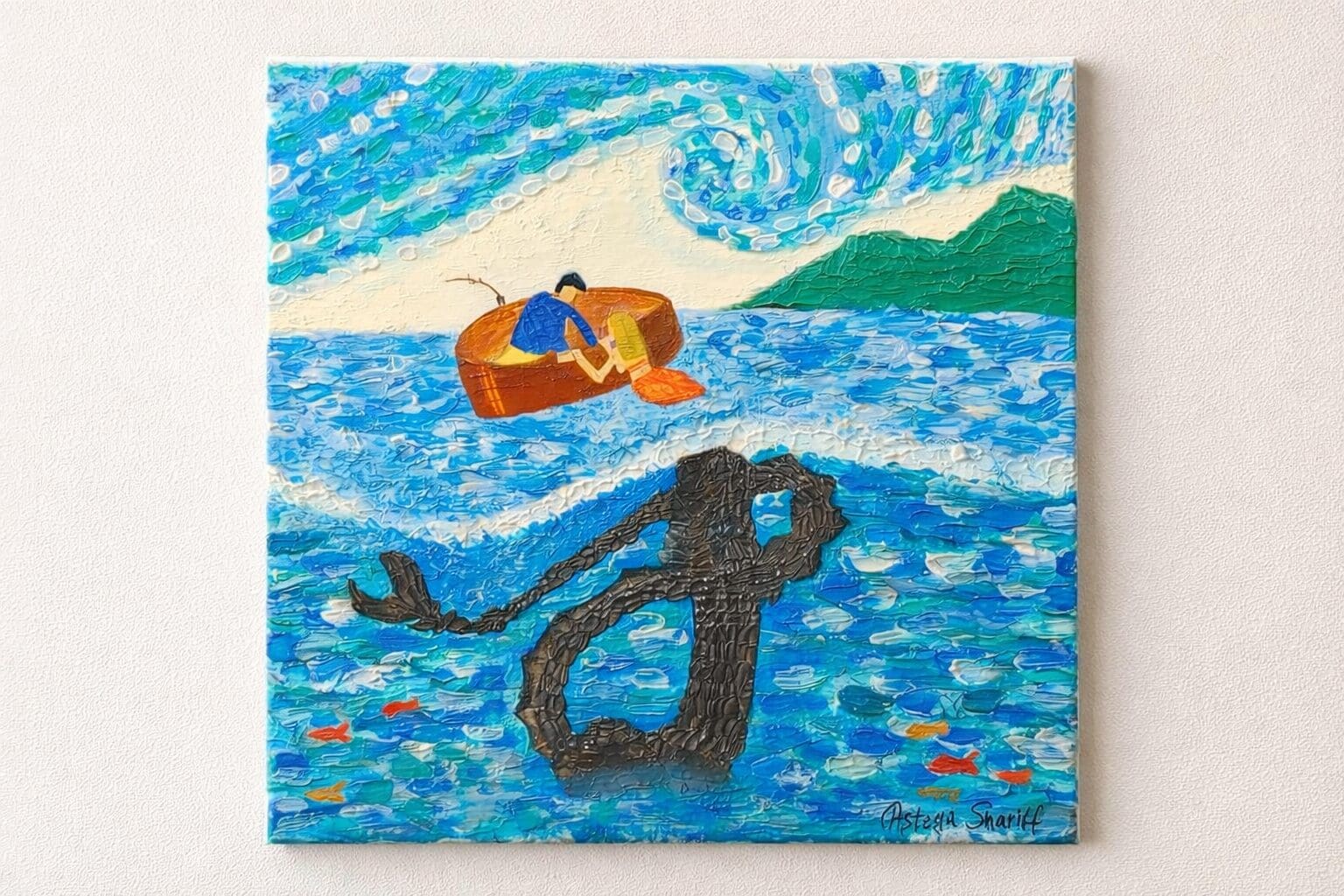Beneath the Calm is an original acrylic painting that explores the tension between what is visible and what remains unseen. At the surface, a lone figure navigates calm waters, unaware of the powerful presence below. Beneath the waves, dark forms move silently, representing hidden fears, emotional weight, and the challenges we carry beneath moments of apparent peace.