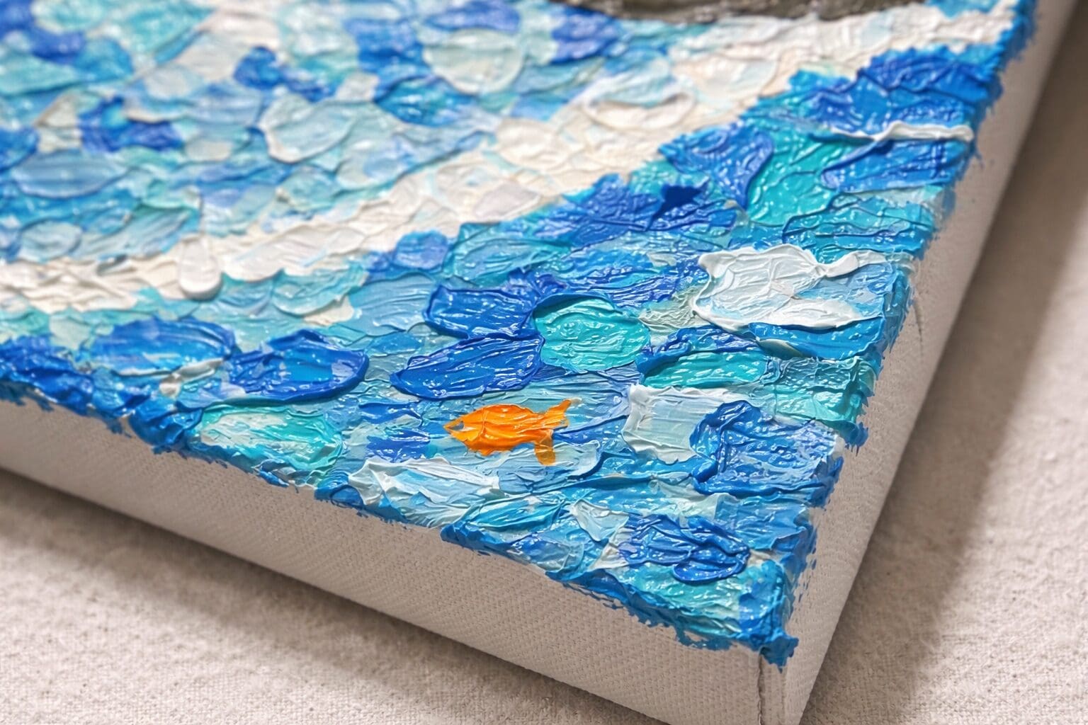 Rich layers of blue and turquoise create movement and depth, while expressive impasto textures bring a tactile quality to the sea. The contrast between the warm tones of the boat and the cool surrounding waters draws the eye and reinforces the sense of vulnerability and quiet determination.