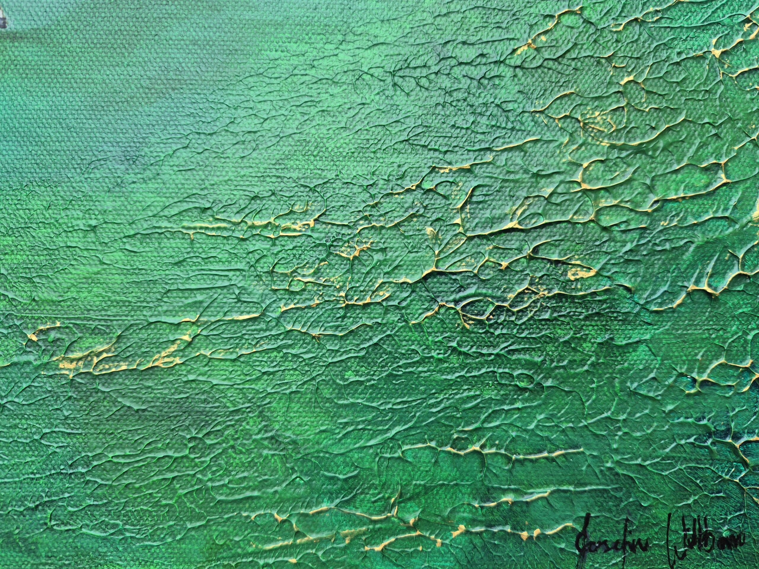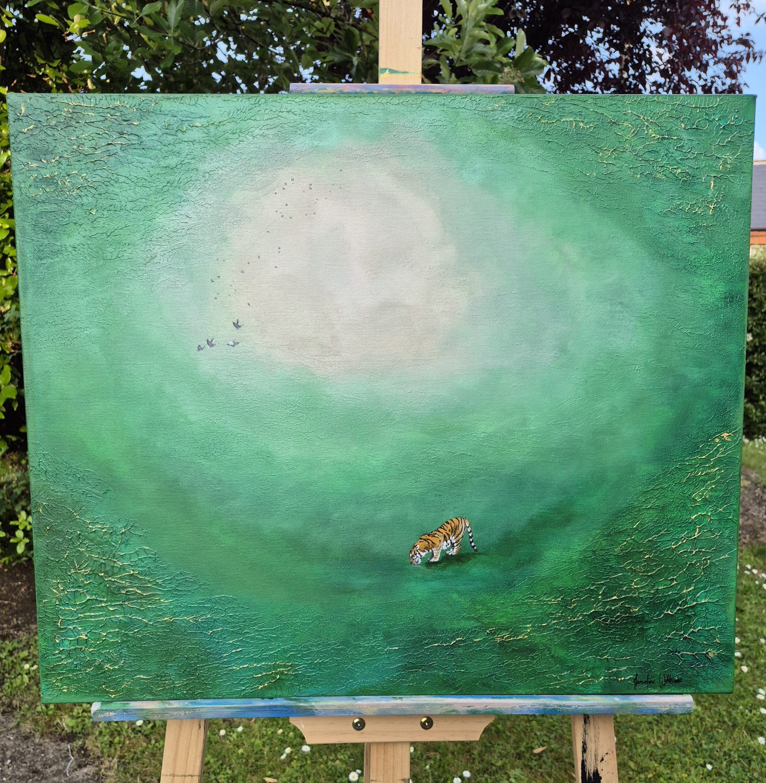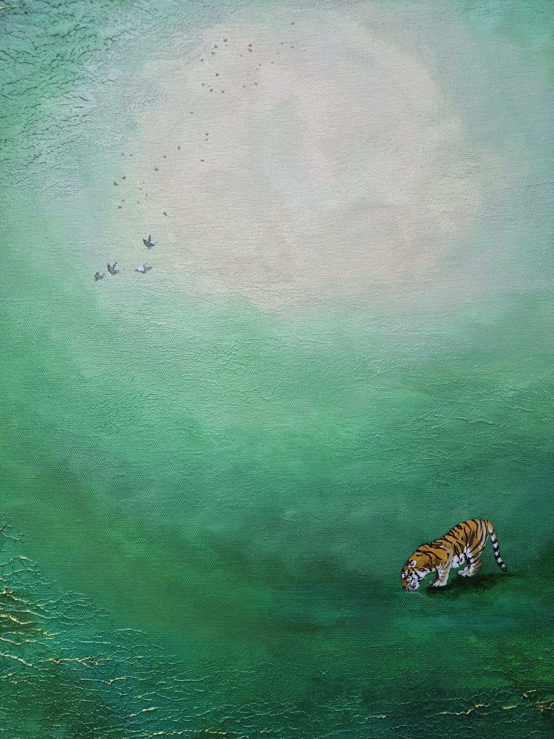 This acrylic painting uses modelling paste and gold details to explore texture and light within a serene, forest-green landscape. A Bengal tiger drinks quietly while bar-headed geese pass overhead, birds known for their extraordinary high-altitude migration.