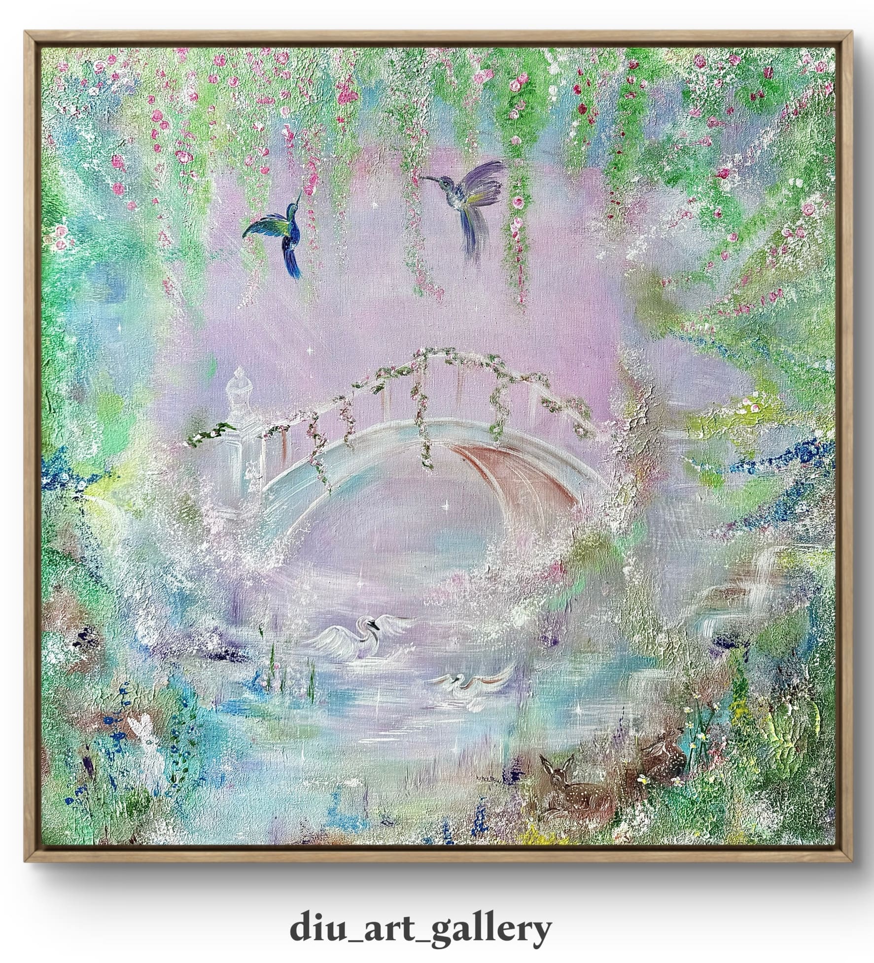 “Blush Swan Serenity” is a large, contemporary acrylic painting that captures a peaceful, romantic scene in soft pink hues. A graceful swan glides through a serene setting, surrounded by delicate floral details and an elegant bridge that adds depth and storytelling to the composition.