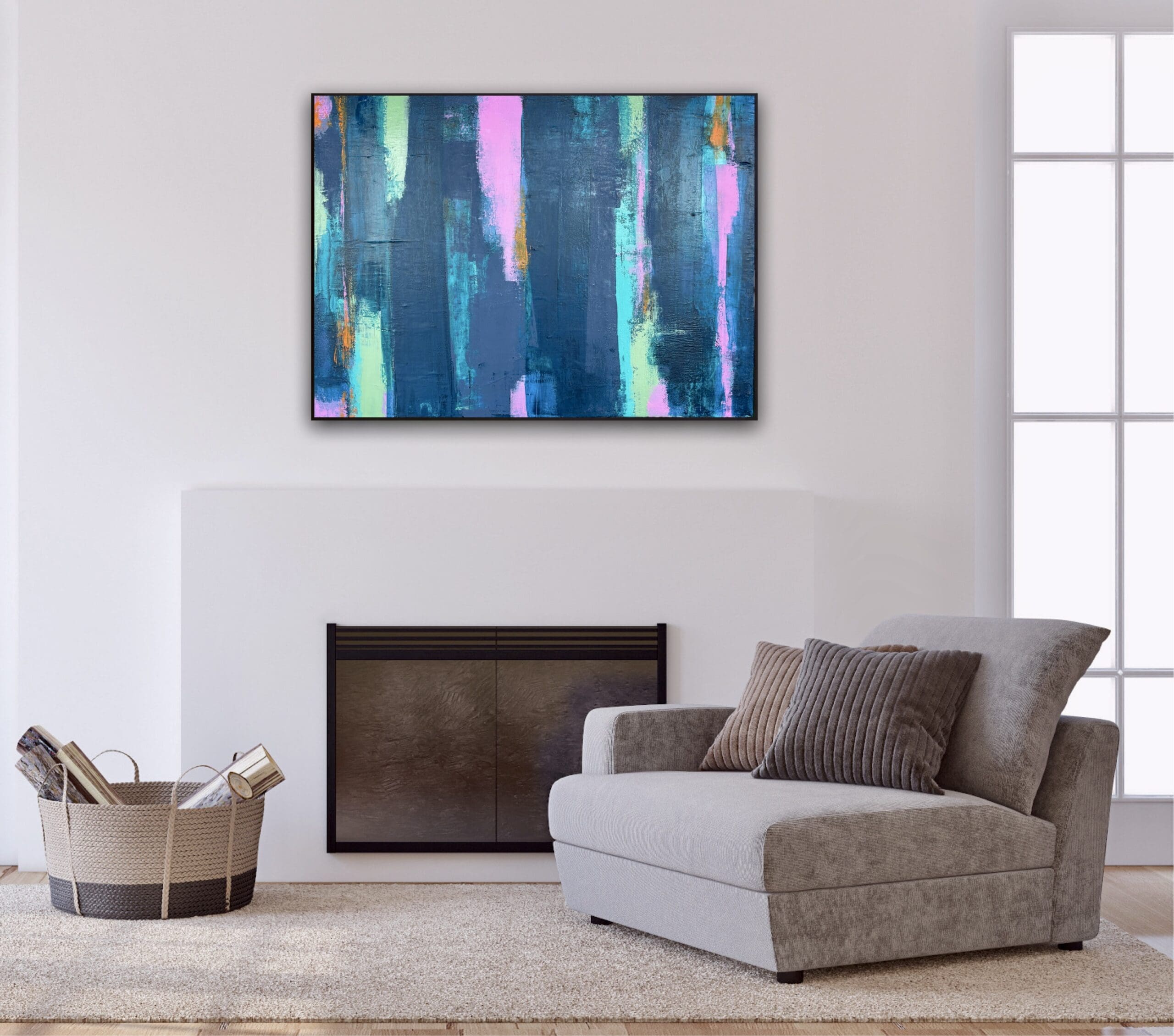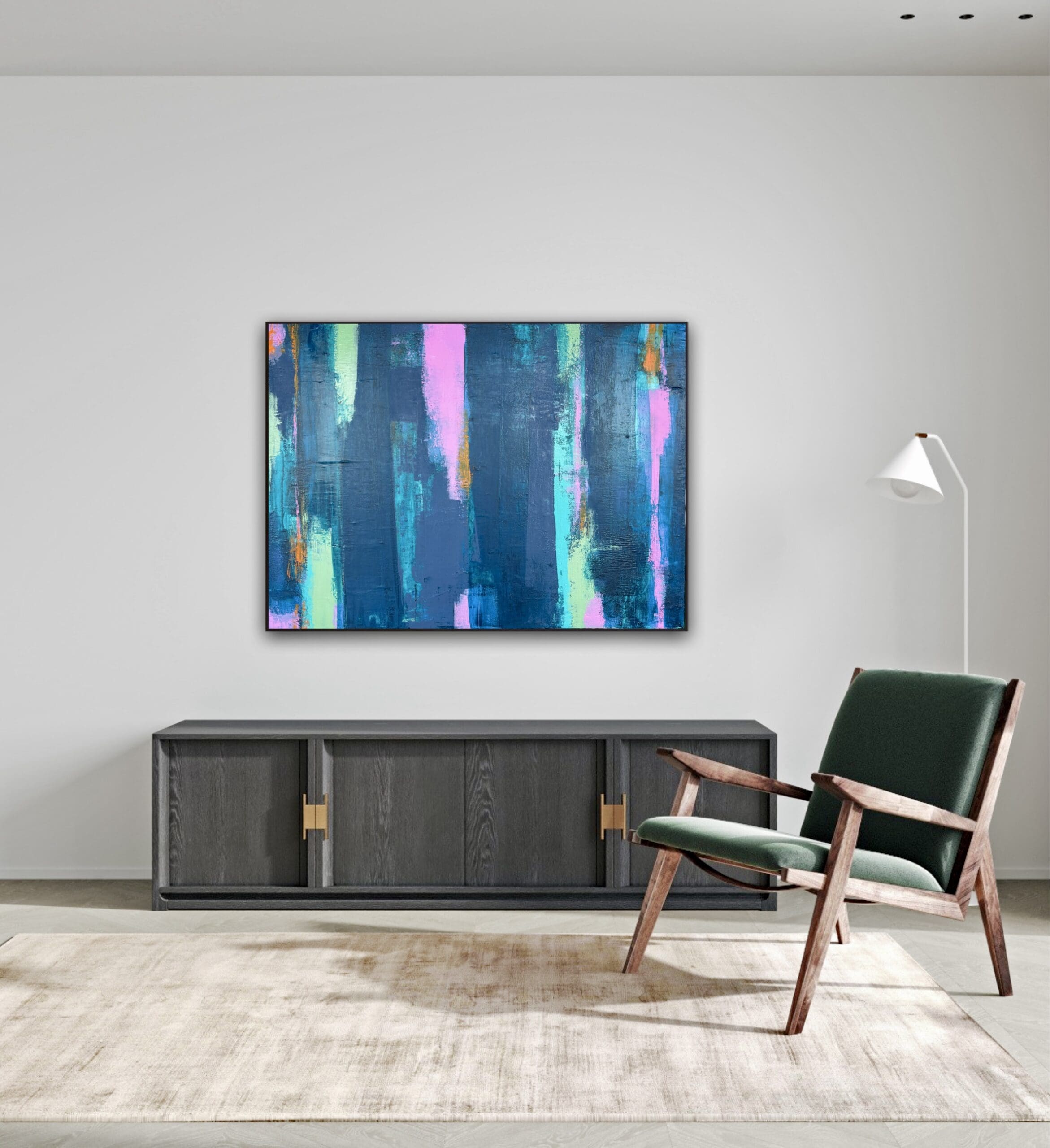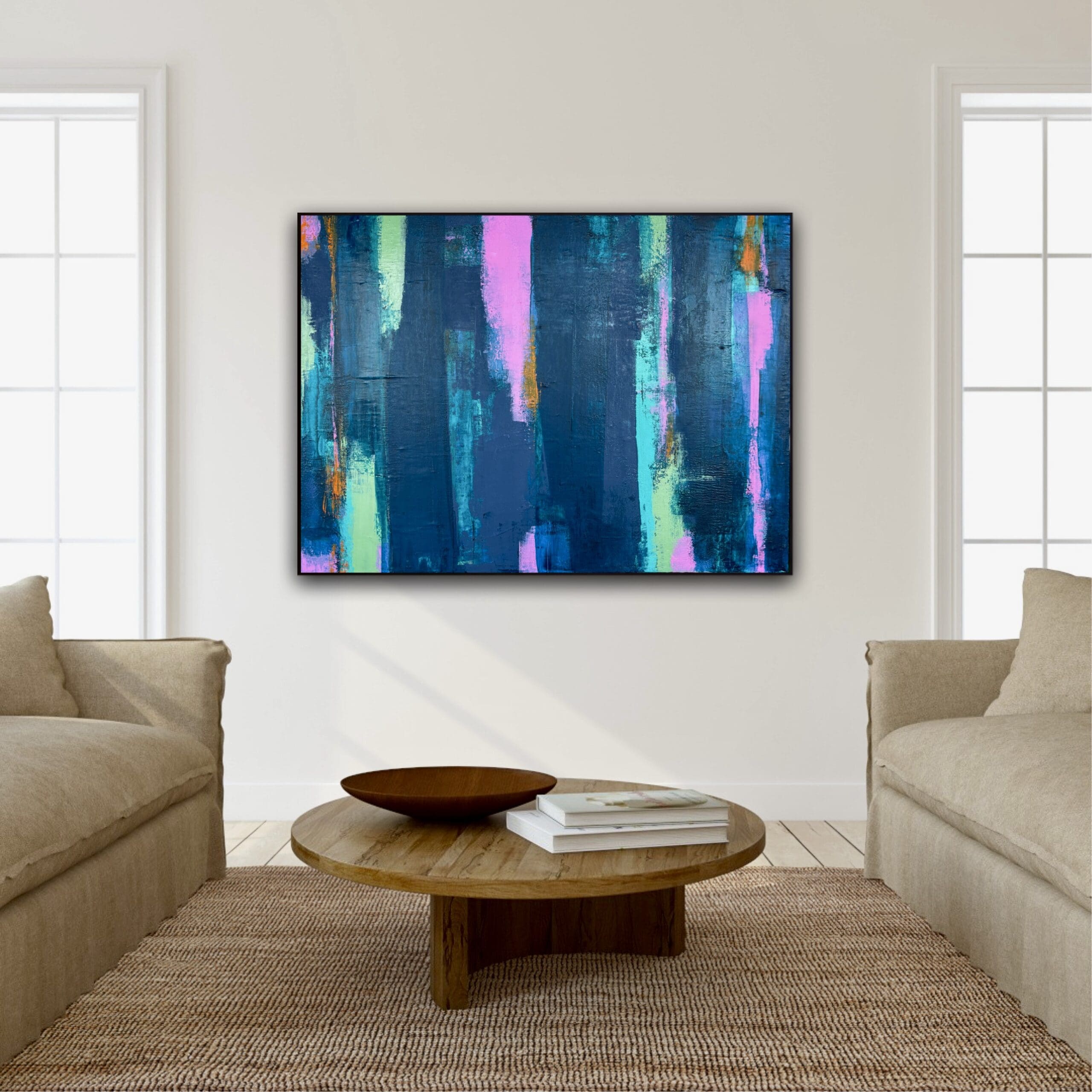 Dark blues, with undertones of pink, teal, olive & orange. A striking modern abstract on deep edge canvas. (May appear larger in mocked photos, check sizing).