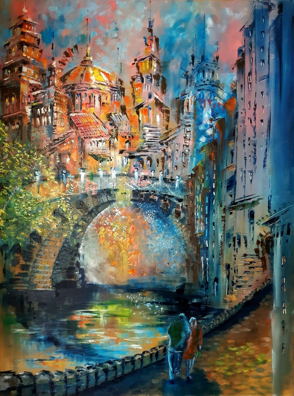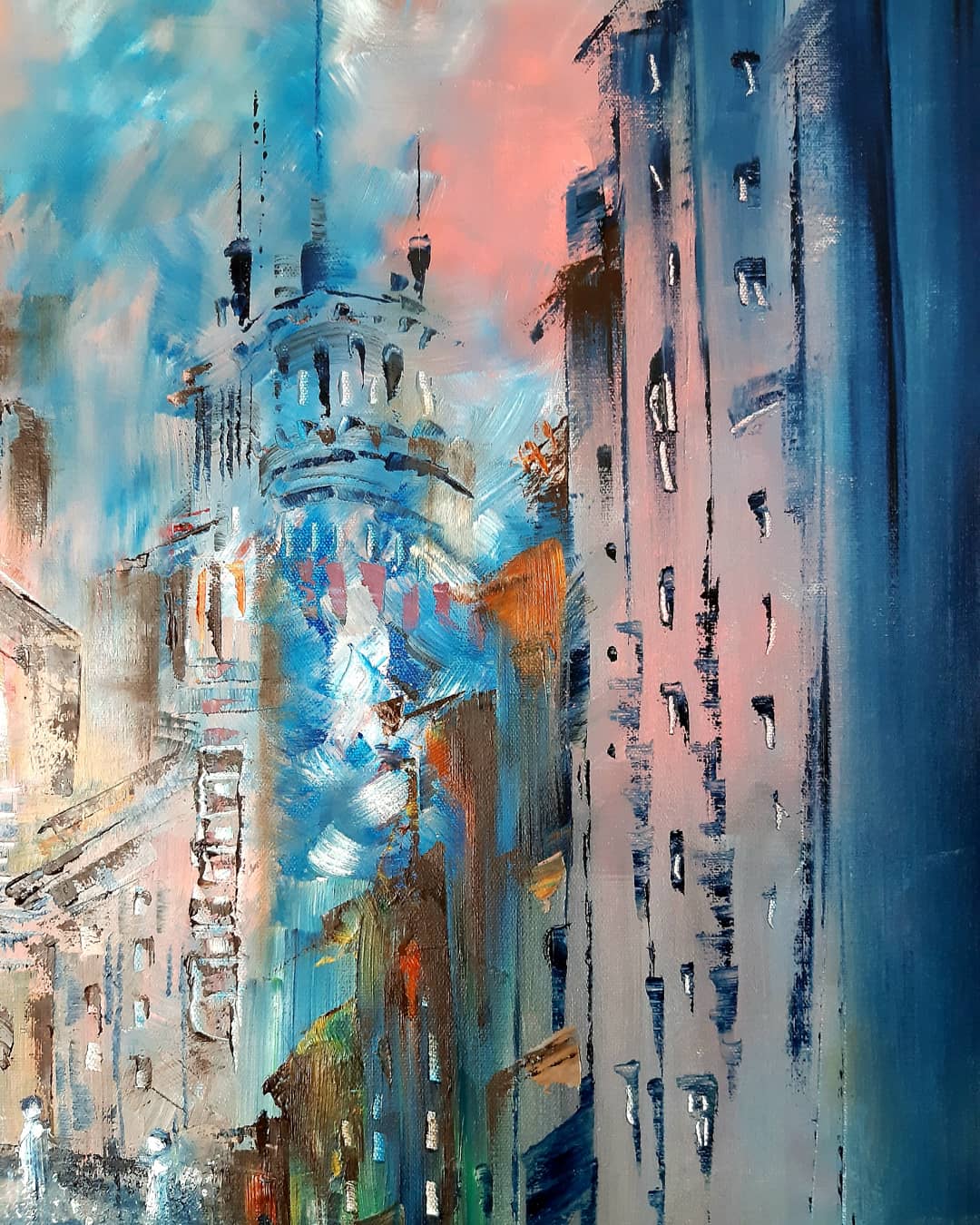 City lights reflected in raindrops, architectural fragments of old streets, all the moods and emotions I write in my imagination to then pass through colours and lines.