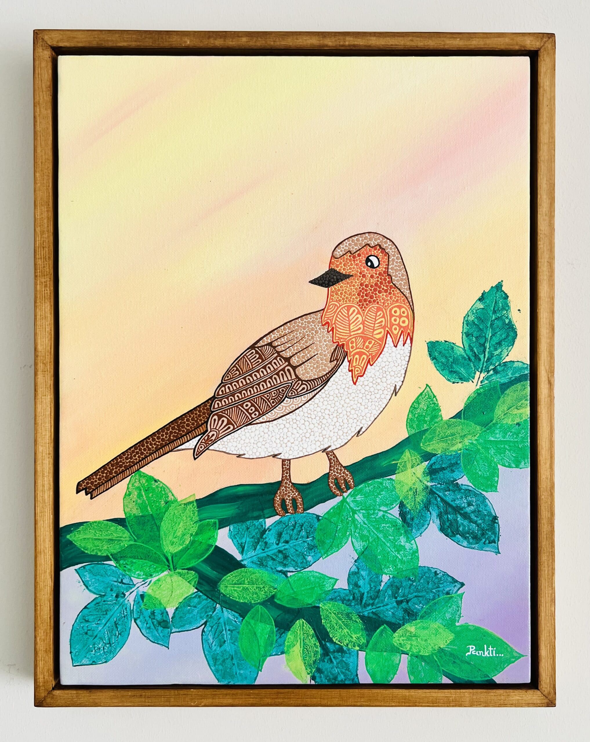 A beautiful golden Robin red breast is happy that the trees are budding and spring has begun. I have added mandala touch to this elegant bird and I am so happy that I can paint it down on my canvas the way I imagined.