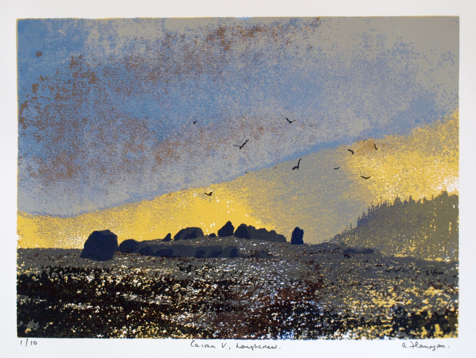 The print depicts Cairn V on Carnbane East, part of the Loughcrew megalithic tomb cemetery. To the rear left of the viewer is Cairn T, on the summit of the hill.