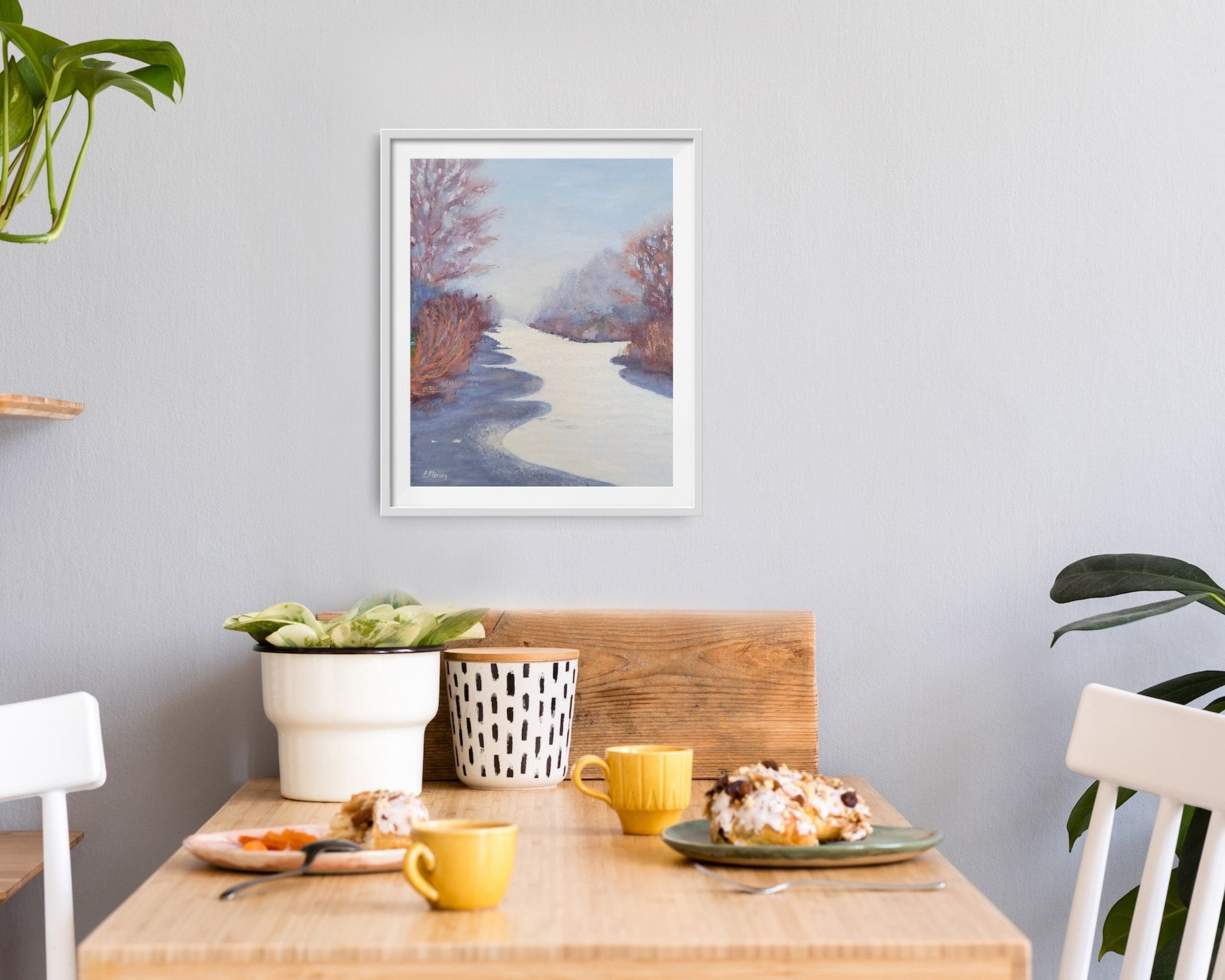 This original oil painting by Elena Fleming was inspired by one of the artist’s walks along the canal in Co. Kildare, Ireland. It was a lovely sunny hazy frosty day. The surface of the canal was frozen and covered with the frost, so bright and white . The artist loved the contrast of the white frost on the canal with the dark frost along the sides and the copper gold of the grass along the banks and the sunny haze everywhere.