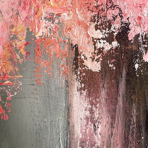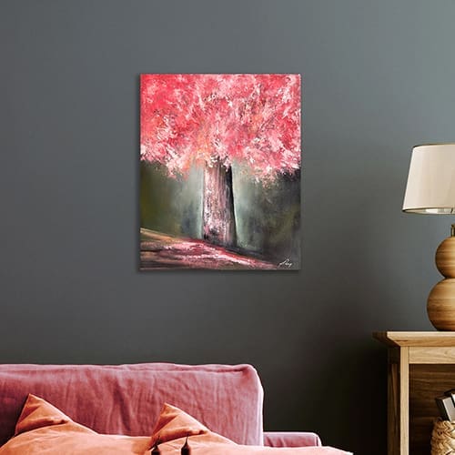 Abstract, textured, painting depicting a brightly coloured cherry blossom tree. Unframed, canvas edges are painted black and the piece is ready to hang. Oil on canvas, 40cm x 50cm.