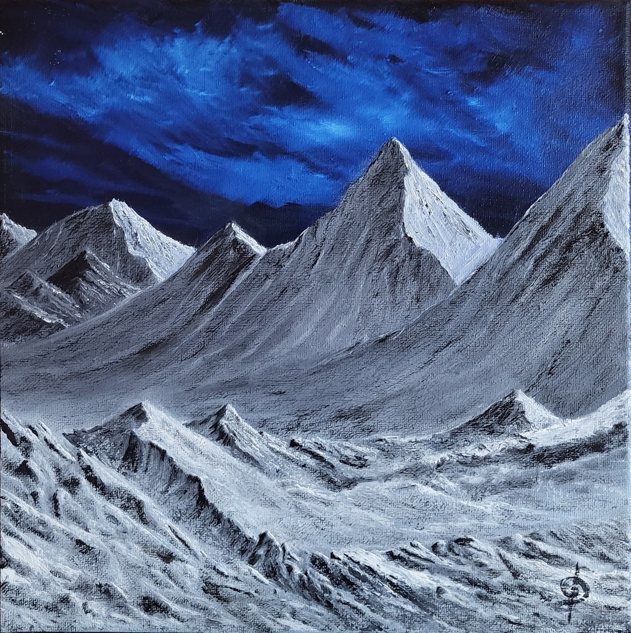 Oil on stretched canvas measuring 31 x 31 cms (#213). This little square painting is one of my favorites as I focused on the mountains to create a very bleak and cold location. I feel the sky just adds to the chilly effect of this piece.