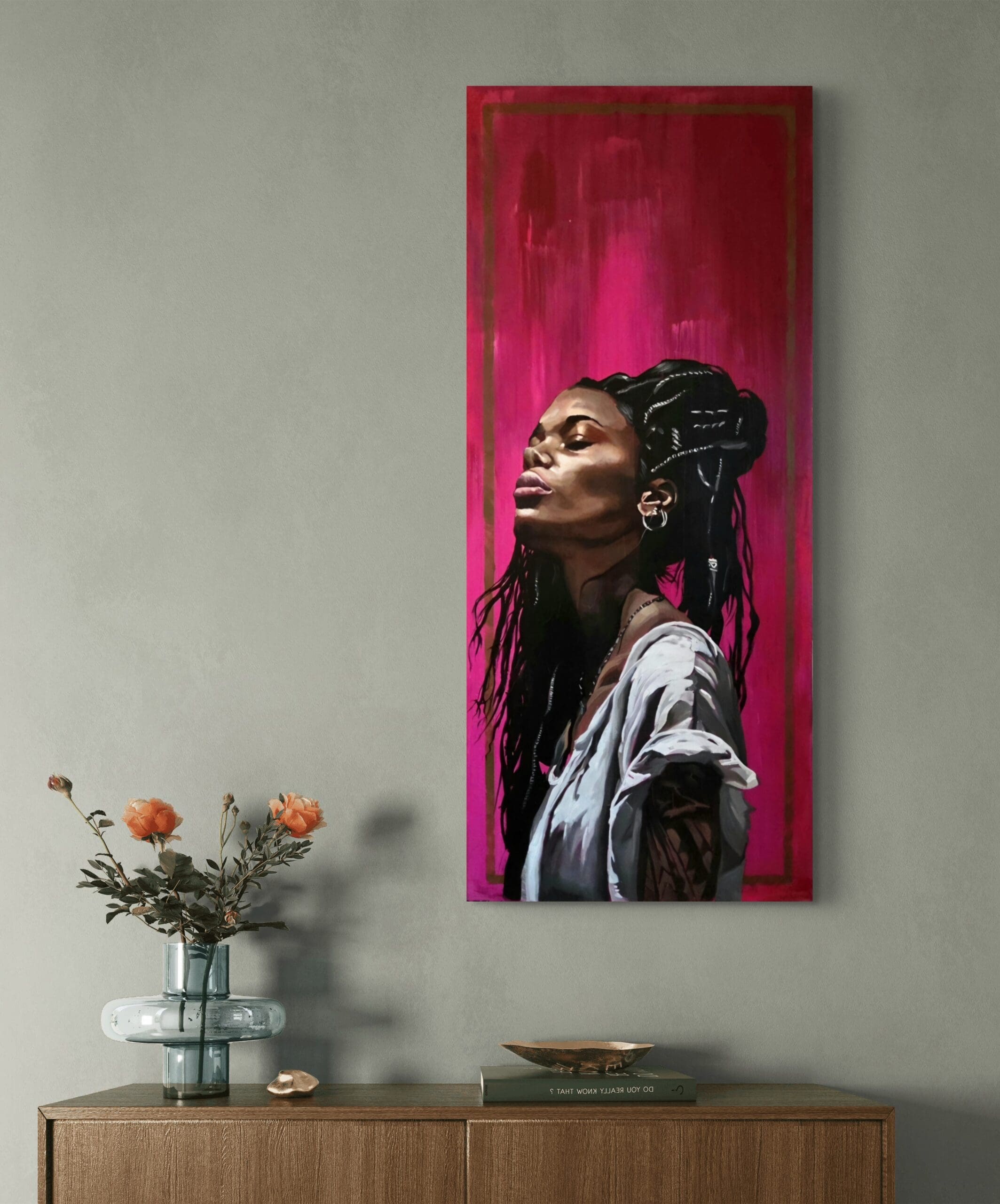 Portrait oil painting with vibrant purple background. Produced on a 40x90cm stretched canvas with a satin varnish