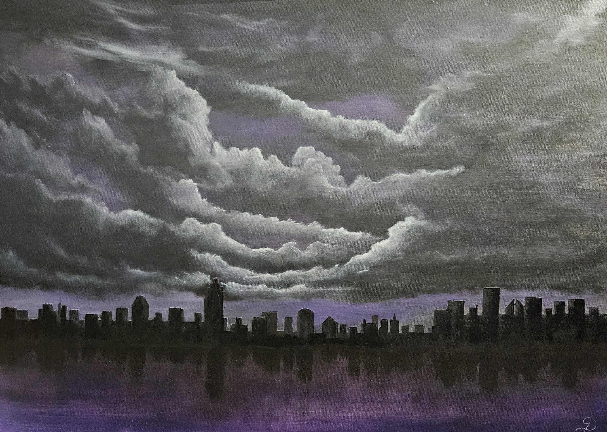 Oil on stretched canvas measuring 65 x 90 cms. This very dark piece was my first painting of a city scape, albeit a very dark one. #414
