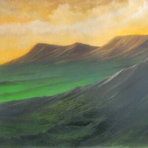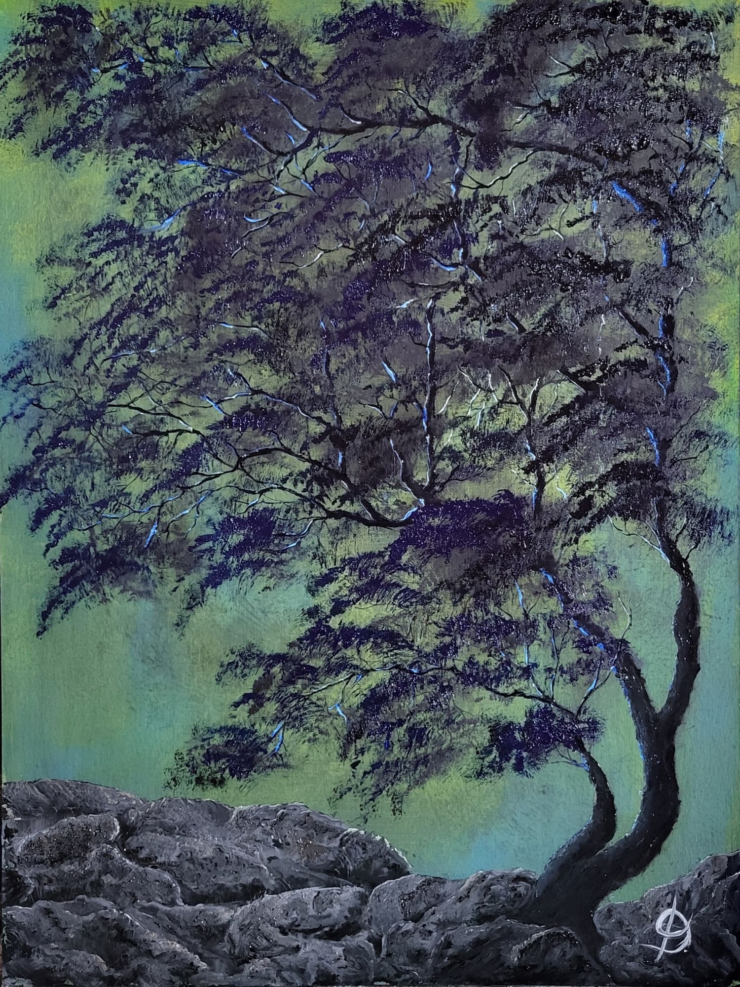 Oil on textured paper measuring 16 x 12 inches. Very ominous looking painting using dark colours against a brighter background. As usual, this kind of appeared on the canvas and just seemed right for the background colours I had mixed. The rocky foreground is something I plan to develop further in future paintings as this attempt works with this piece. #417
