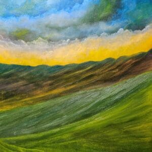 I started painting in 2022 after Covid and when I made the decision to leave my job after 36 years of employment for a large US company. I had never painted before and decided to give it a go to keep myself busy while creating some art. It’s been a journey and I think I am improving. I don’t have the right mindset to paint any real locations so everything I paint just appears on the canvas, textured paper or recently on the wooden panels I upcycle when they become available.