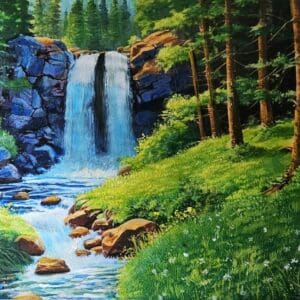 A dramatic seascape that portrays a lighthouse standing firm as towering waves smash against jagged rocks beneath a storm-dark sky. Energetic brushwork renders the spray and swirling water with convincing motion, while distant seabirds and a low, clouded horizon add scale and tension. Cool teal and slate tones contrast with brilliant white foam to create depth and drama. An arresting piece that would make a strong focal point in a living room, study, or entryway.