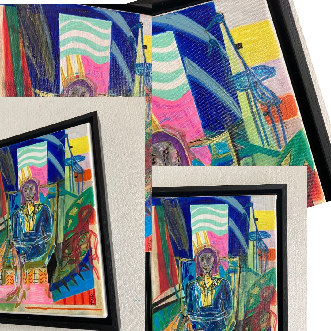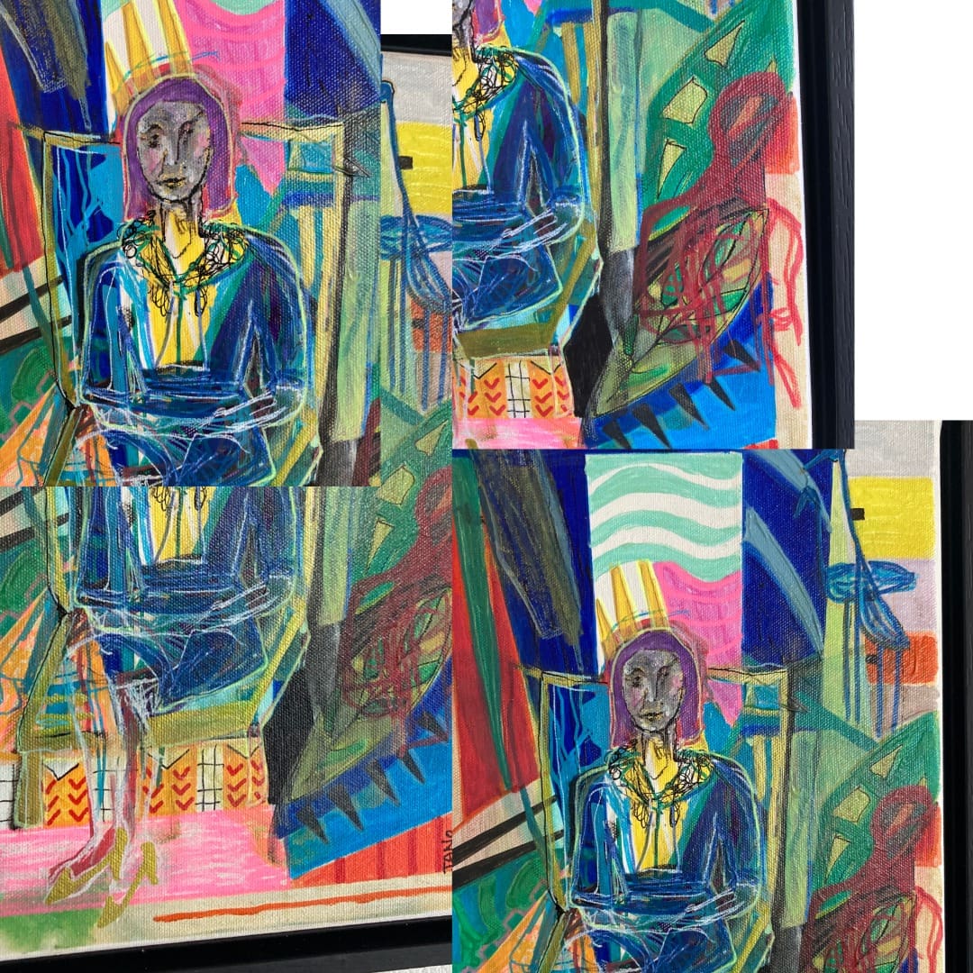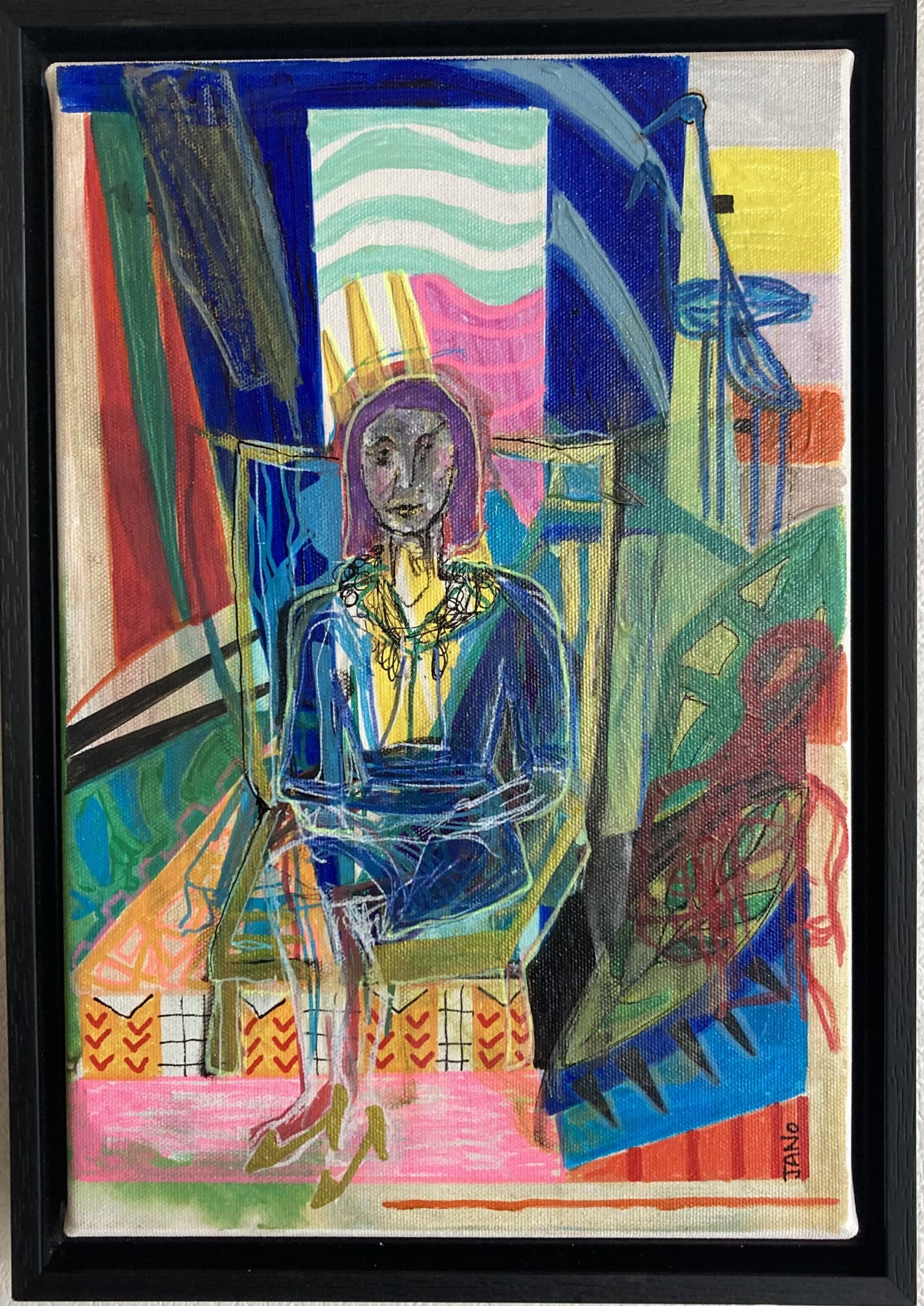 Original figurative artwork on a bright abstract base. She has the air of an interviewer or interviewee – she is poised and ready to shine.