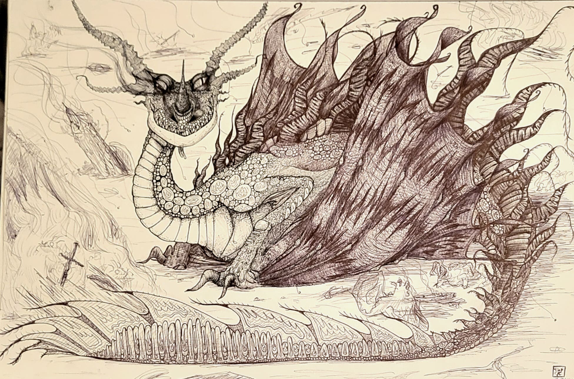 Dragons on the Old Battlefield is a 29.7 cm × 42 cm work made of (several) ink pen on multi-purpose paper. It features “Corndog” the Dragon with his tiny, flaming companions. (I was told to give him a name.) Please pardon my shattered phalanges.