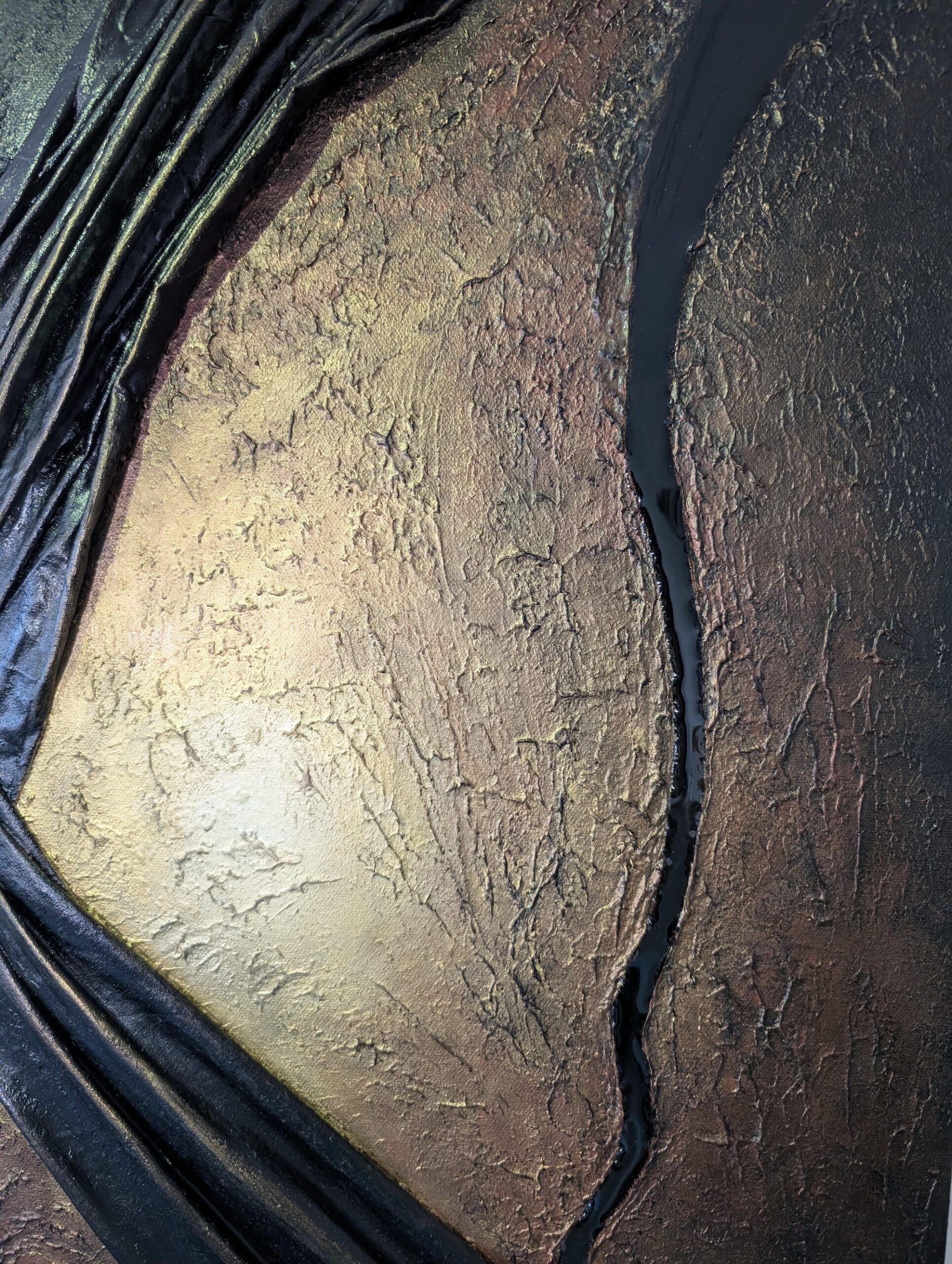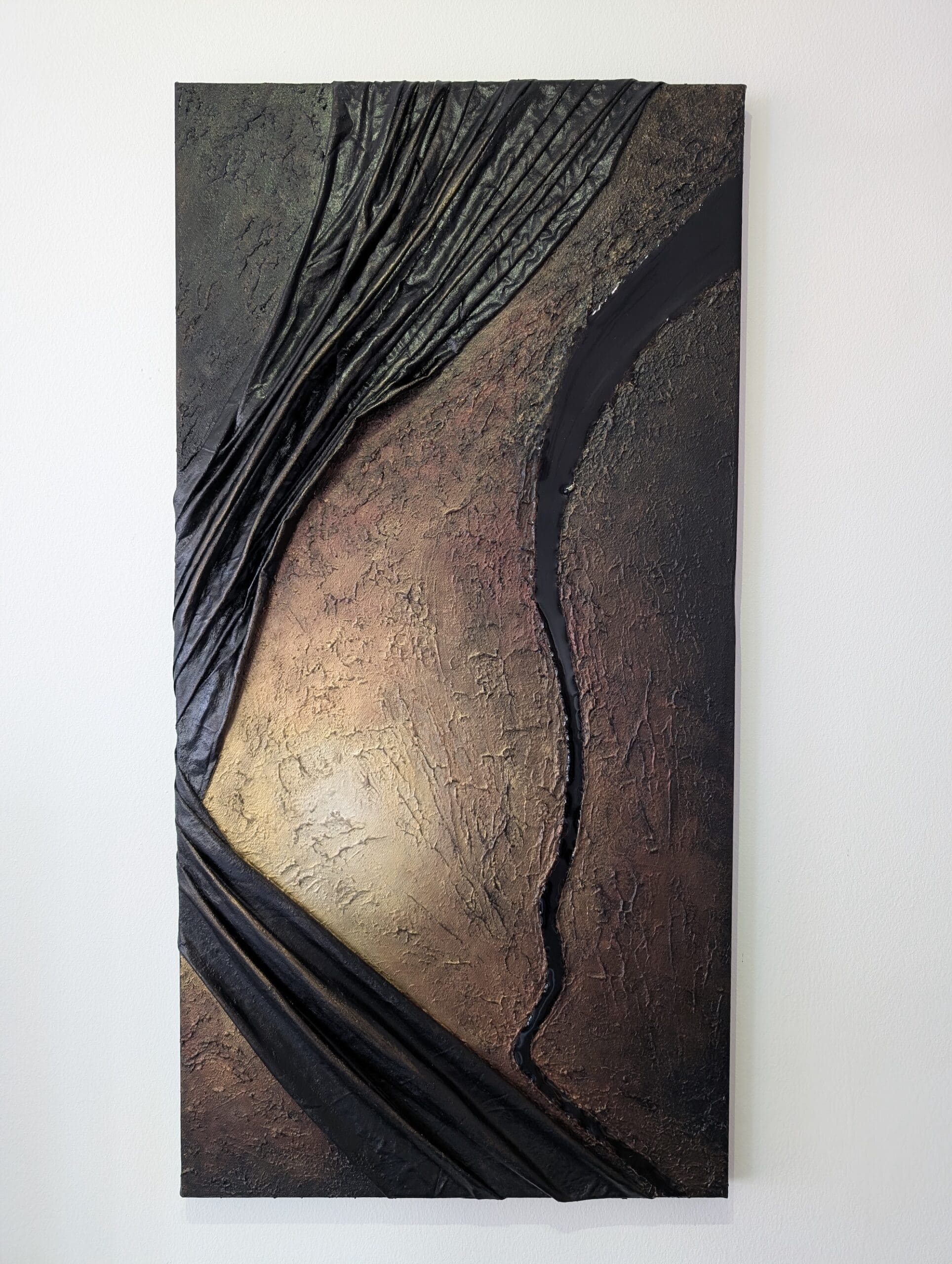 This rectangular canvas combines draped black fabric texture and sculptural elements to create dramatic visual narrative. Light radiates from a golden point, blending into bronze/red tons before fading into deep black, creating a sense of mouvement and transformation. A black epoxy river draws the eye along it’s path.