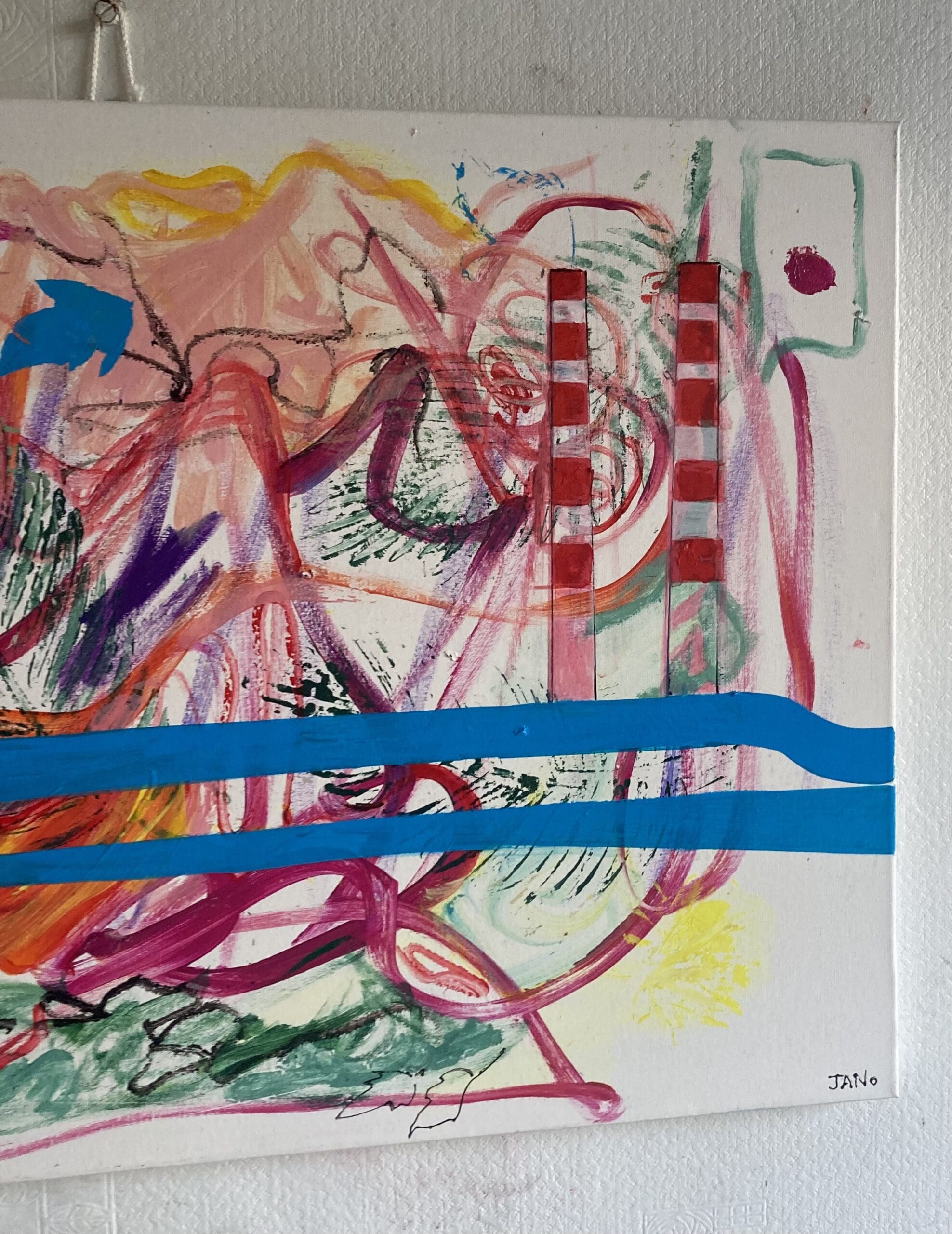 Bright colour marking abstract artwork featuring the Poolbeg chimneys.