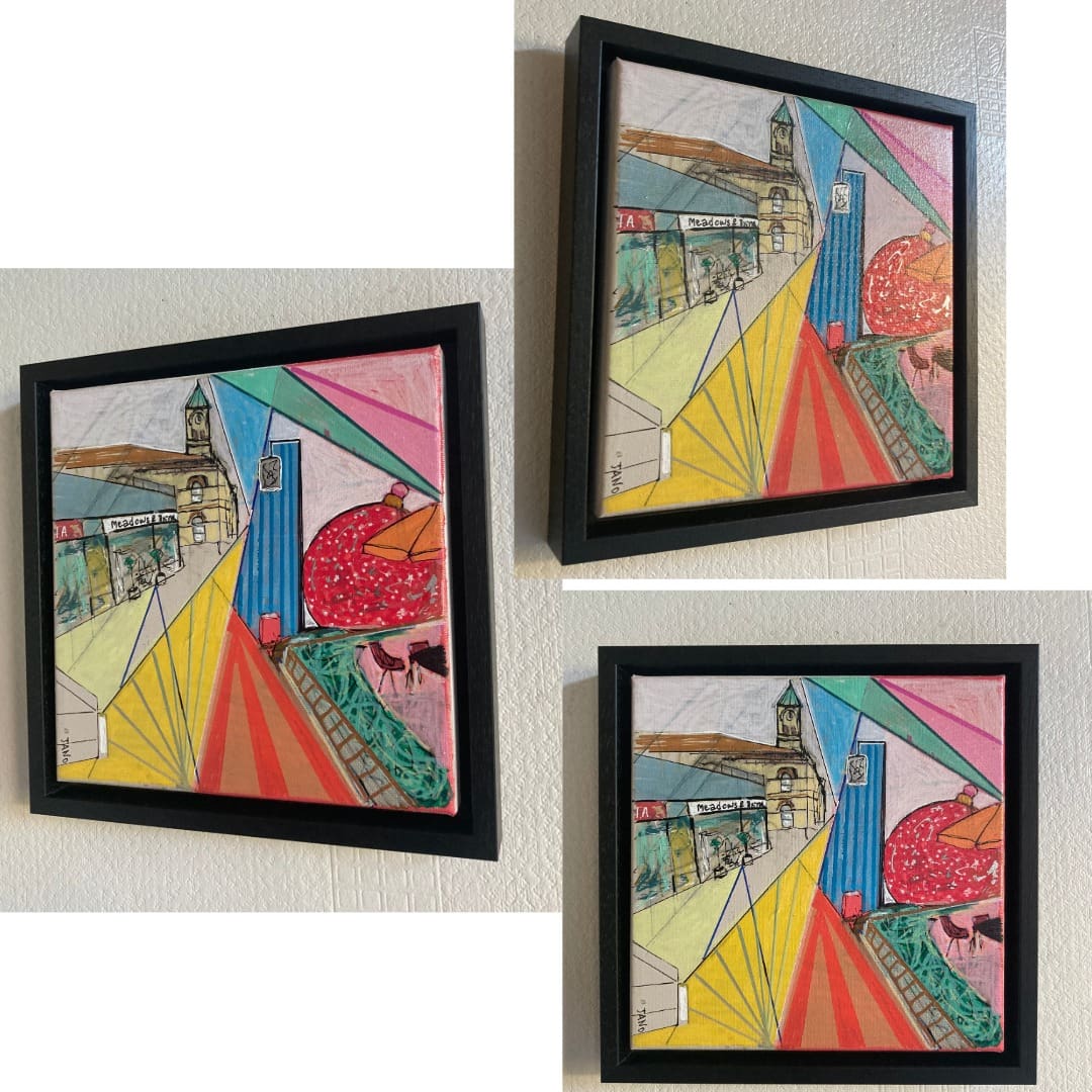 Original streetscape of the Promenade at Dun Laoghaire Dublin Ireland in November 2024. With colourful abstract elements.I painted from a photo. Created using acrylic paint, acrylic markers and pens.