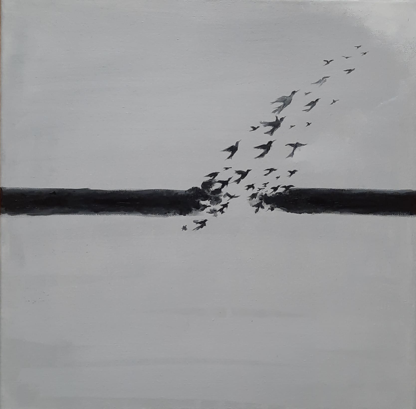 Abstract black and white oil painting on canvas featuring a single broken line from which birds emerge in flight, symbolising freedom, transformation, and the moment of breaking free.