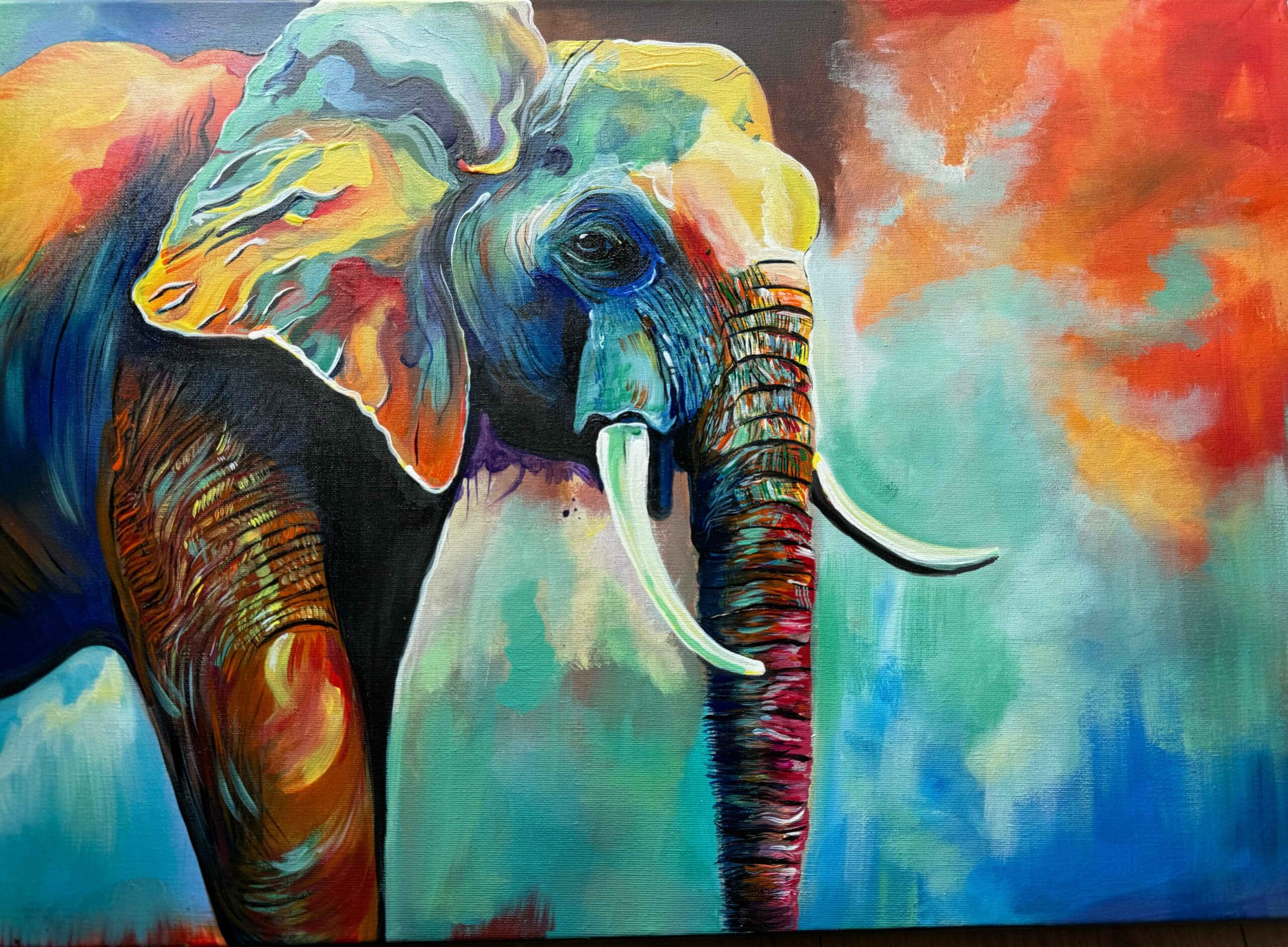 This painting speaks to resilience, intelligence, and emotional wisdom — qualities long associated with the elephant across cultures. Its scale and chromatic intensity give it a striking architectural presence, making it ideal as a focal work in curated interiors, contemporary collections, or spaces that value art with both visual impact and symbolic depth.
