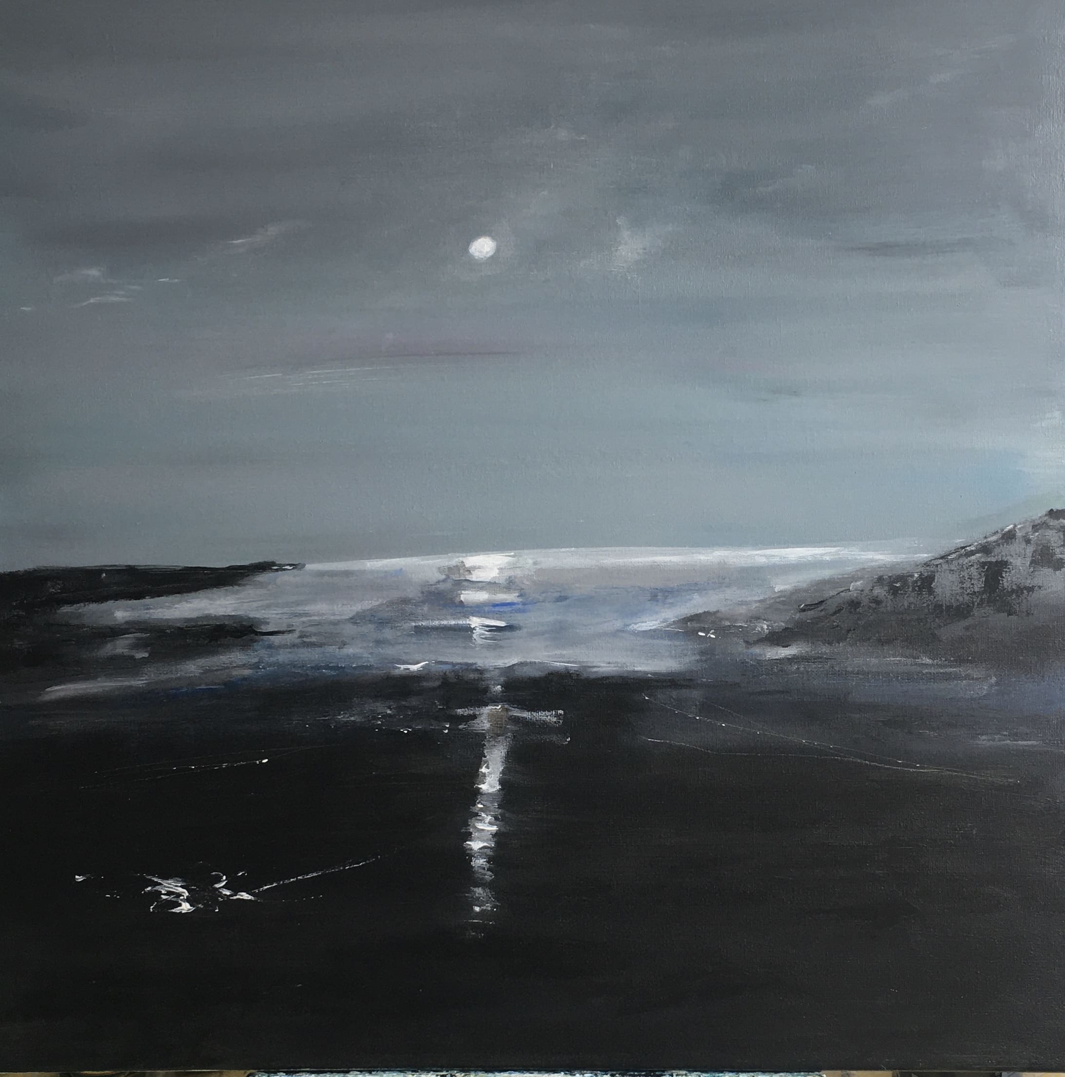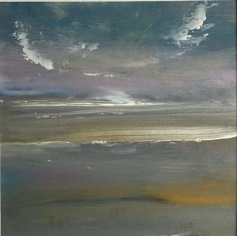 Contemporary small artwork depicting evening beach scene. Empty beach with distant seaspray. The painting is in acrylic on canvas board, currently unframed. Please ask about framing cost.