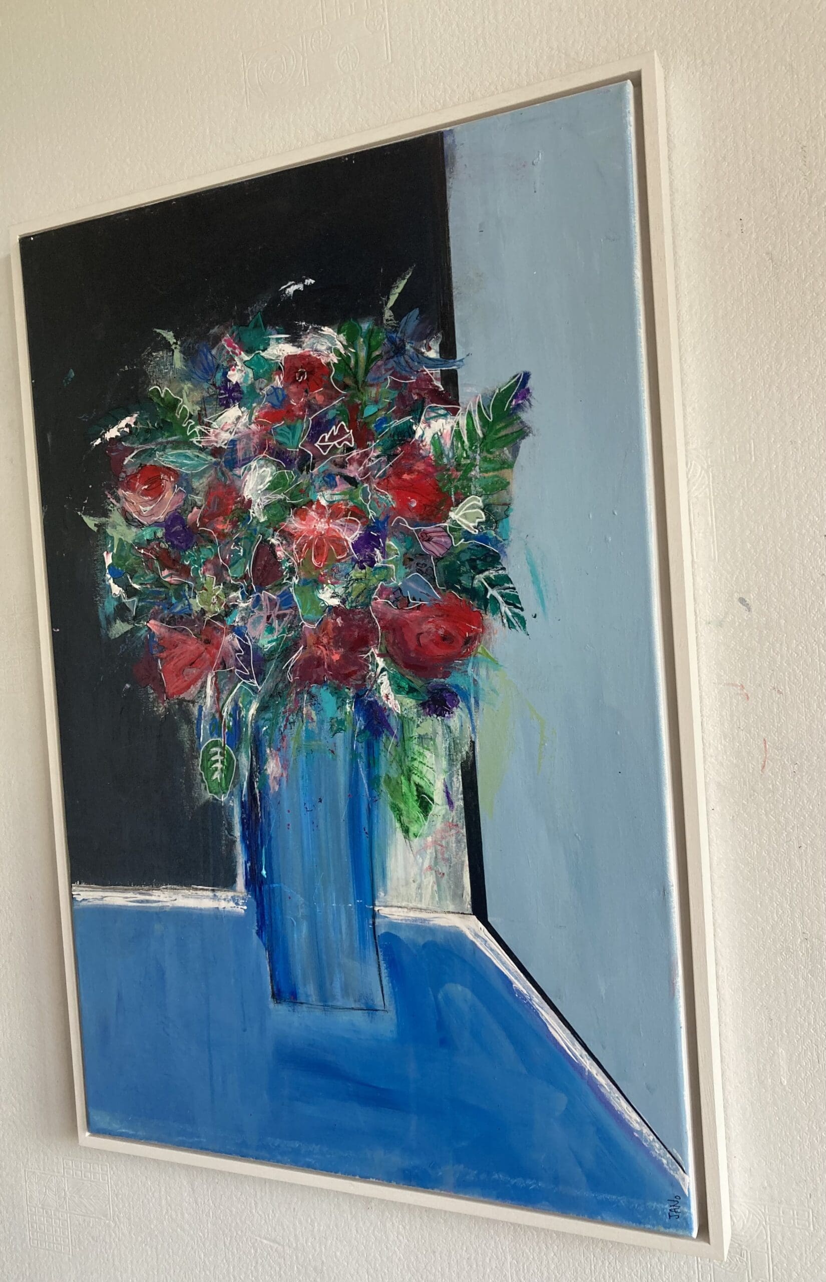 Original feature floral painting in blues and vibrant reds.