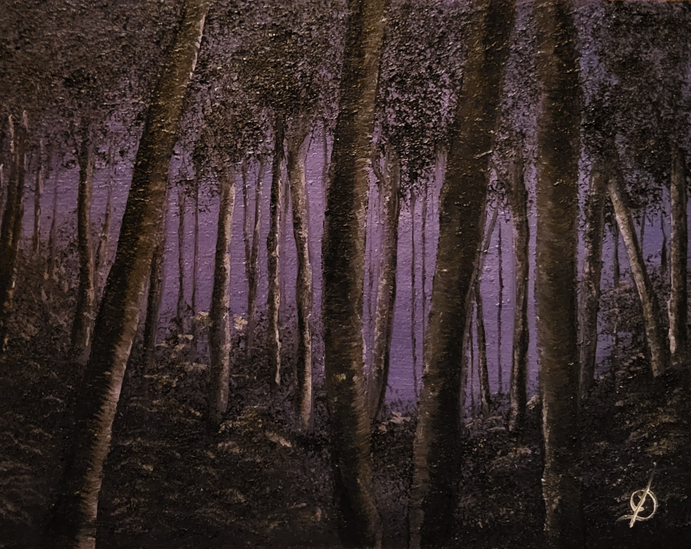 Original acrylic on panel #276 measuring 28 x 36 cms. The creation of the background colour led me to add the forestry scene to bring out the trees and other elements of the painting against the backlight.