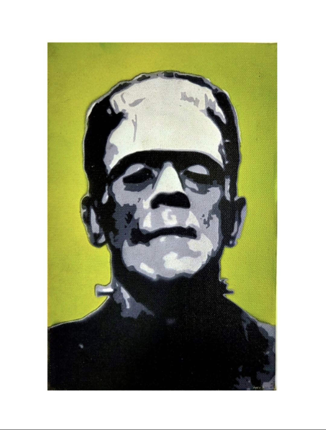 Portrait stencil art of fictional monster Frankenstein. Produced with acrylic spray paint on a 20x30cm stretched deep edge canvas with a satin varnish finish