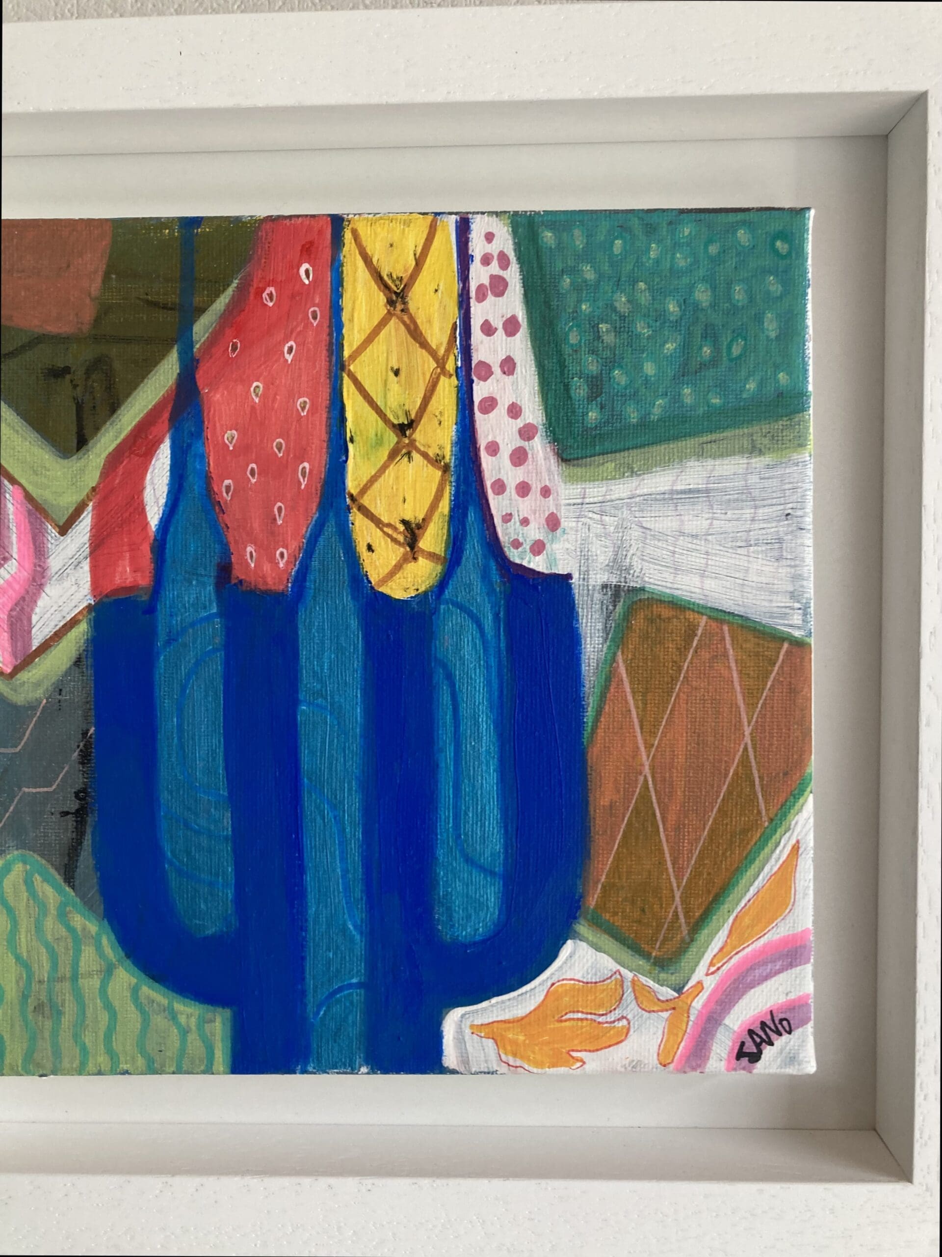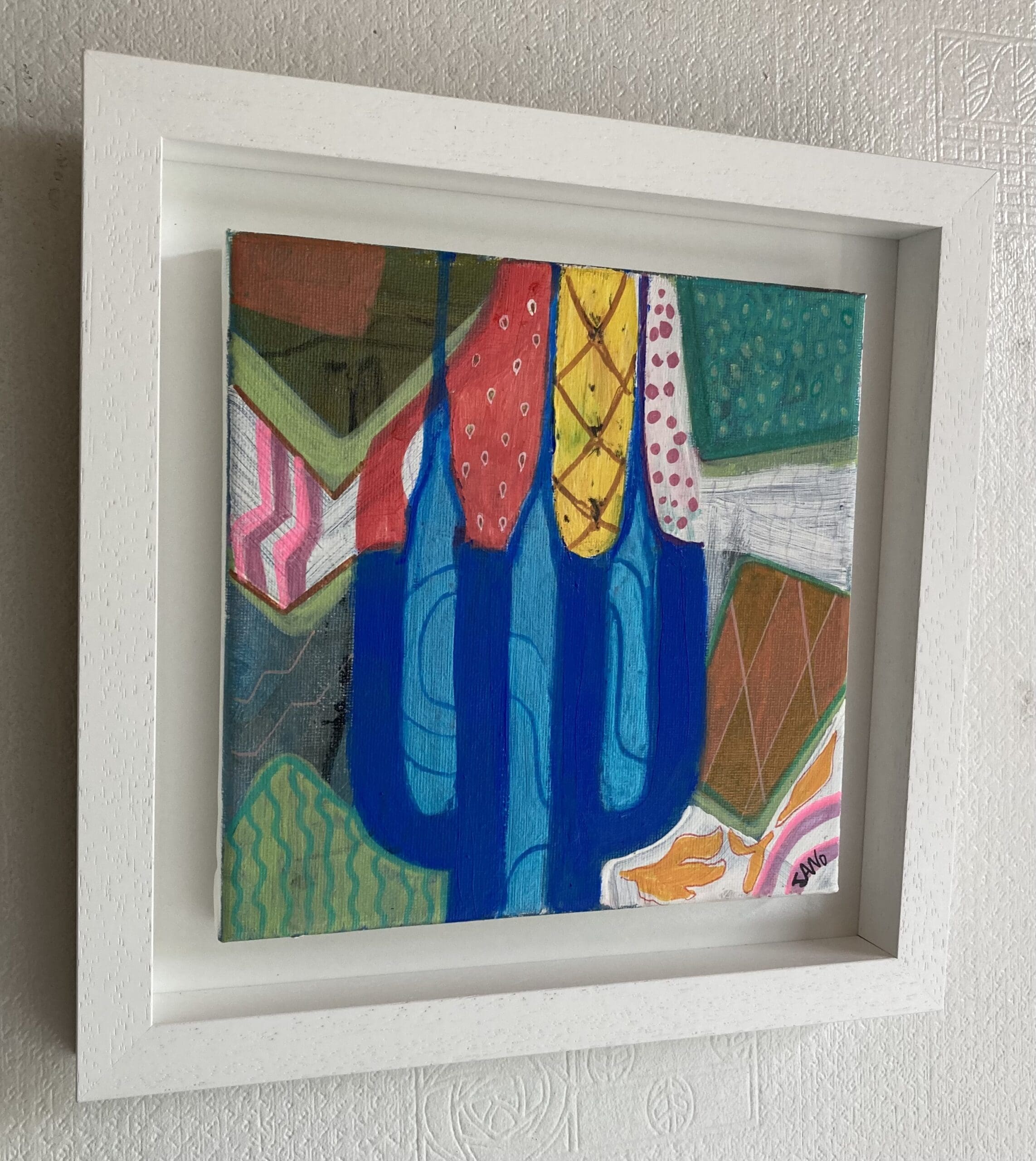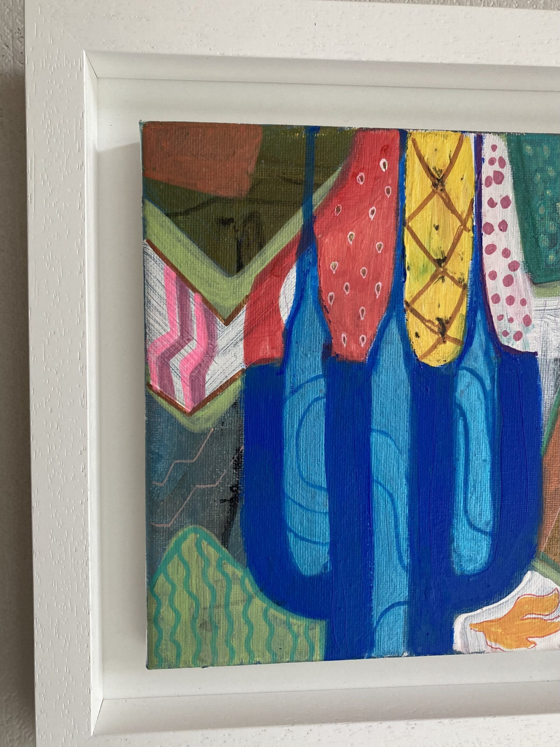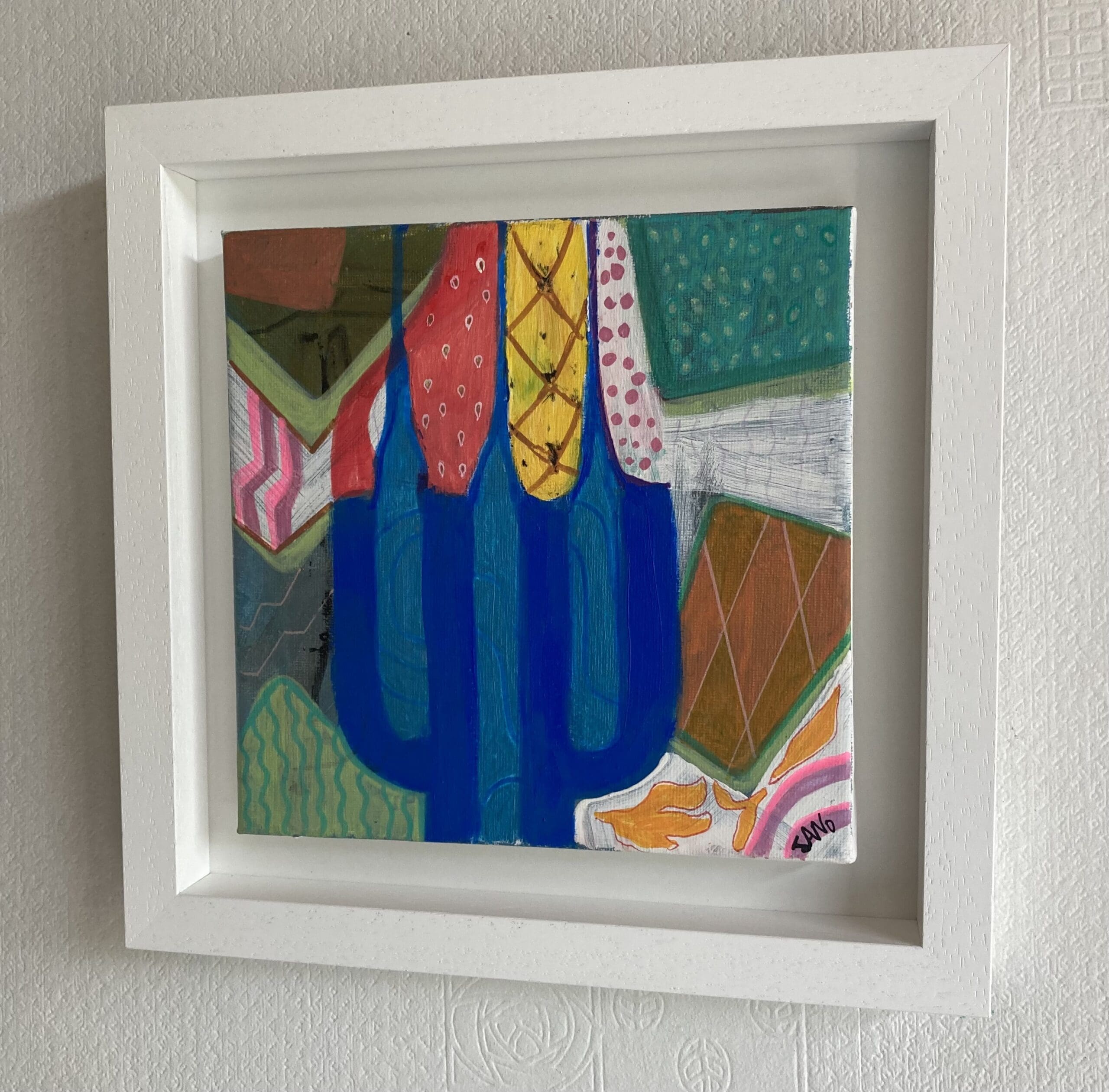 A bright eclectic candleholder come fruit bowl. This abstract artwork has been influenced by the trend of tubular household decor, and rendered in the fauvist colours I favour. Some blue metallic paint used which catches the light as in photos. Framed in a white wooden tray frame.