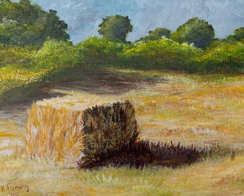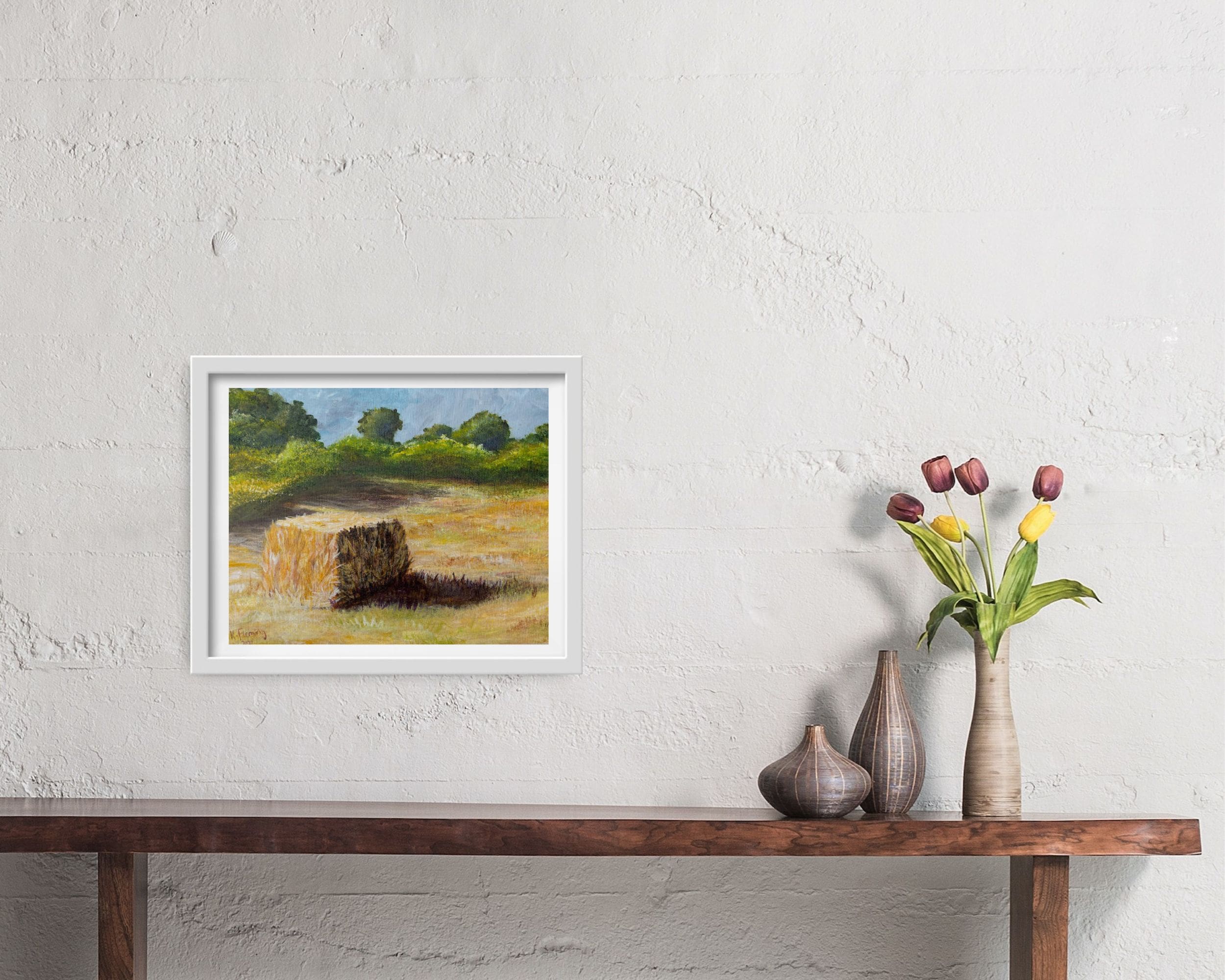 Original painting showing golden field and a haybale on a beautiful hot summer day in Irish countryside.