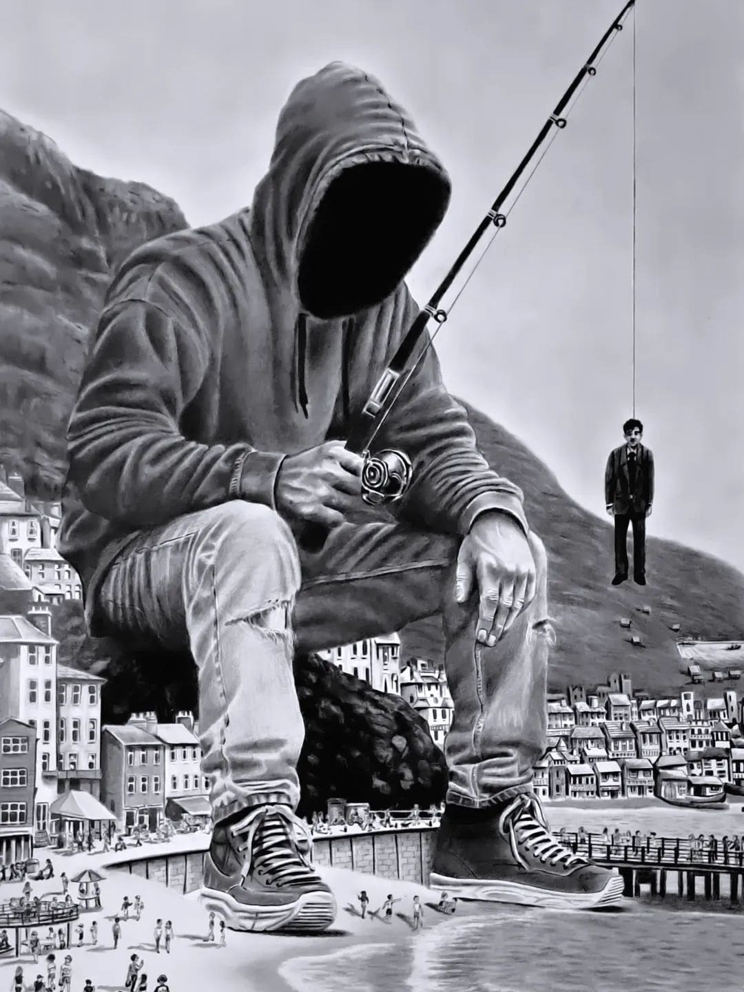 When society is viewed under the microscope, the act of casting a metaphorical line to entice the vulnerable becomes a commentary on how addiction takes root.