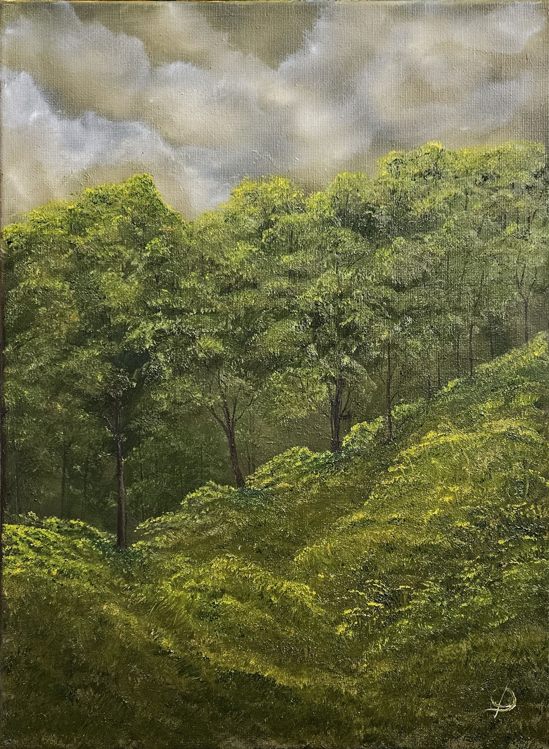 This piece #188, is an oil on stretched canvas piece, 42 x 30 cm, named Green Woods. This use of green in this piece blended into the sky in the background and adds to the piece.