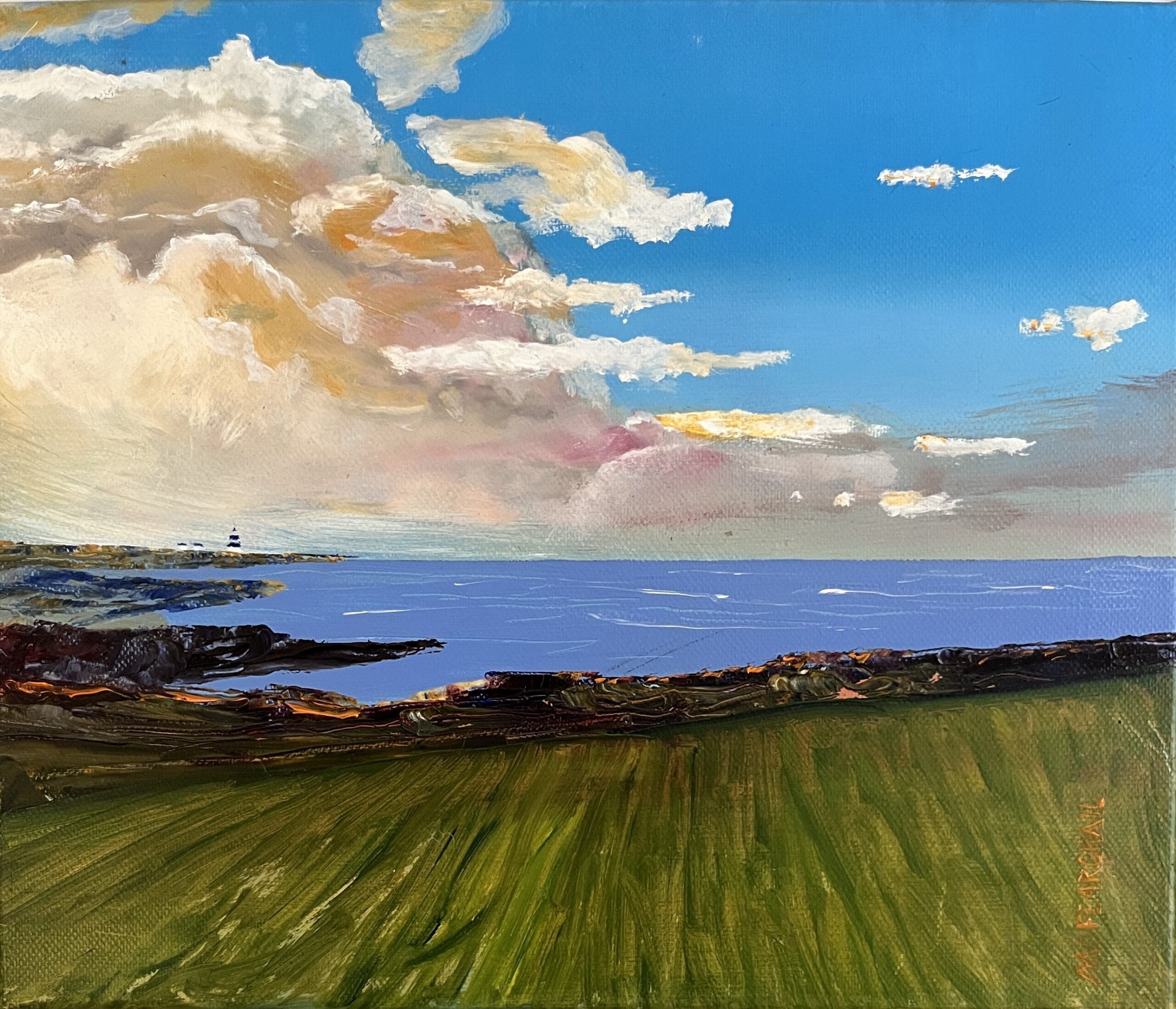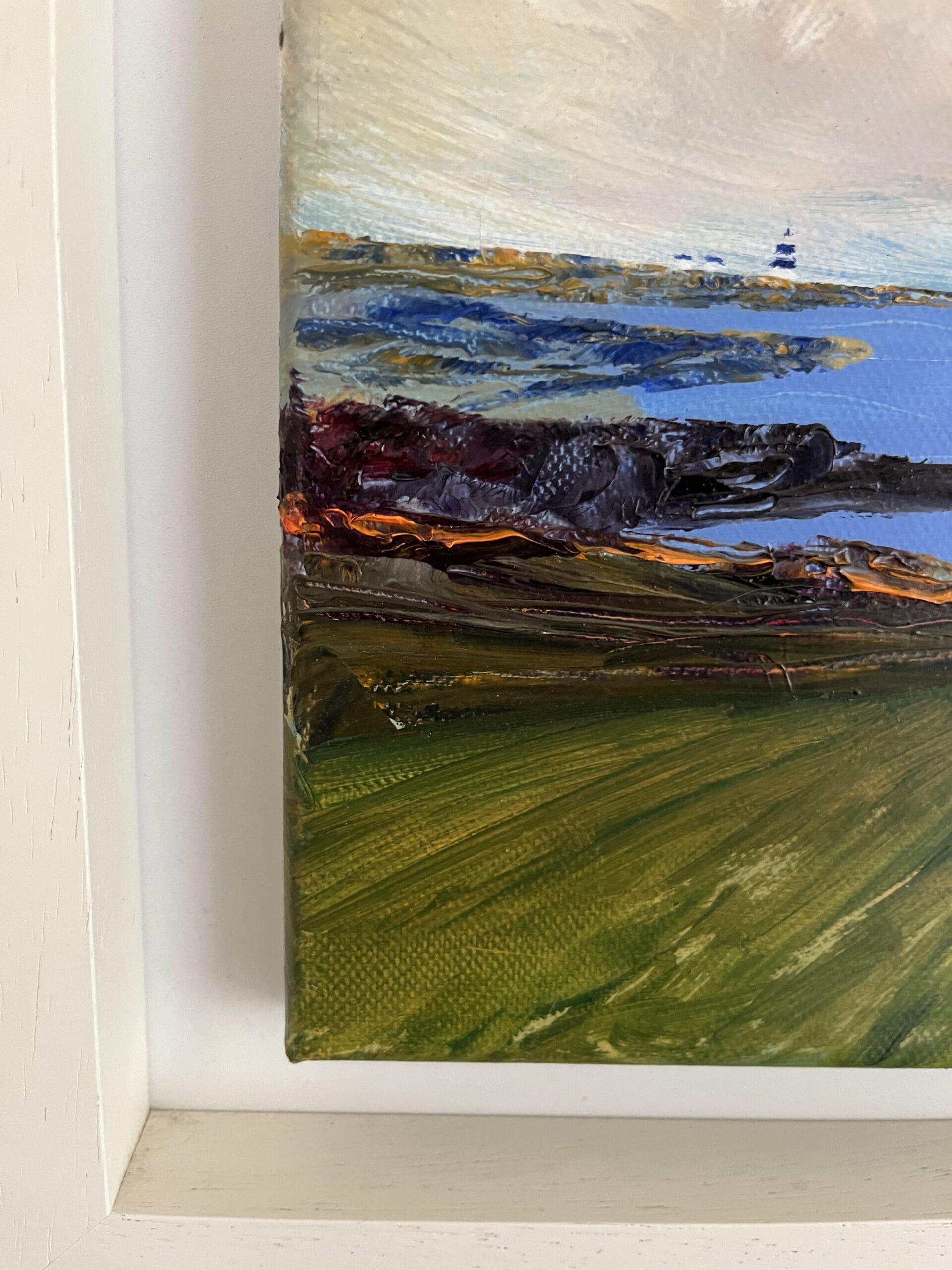An acrylic painting on canvas, framed in white, depicting the Wexford shore of the Suir estuary, with Hook Head lighthouse in the distance.
