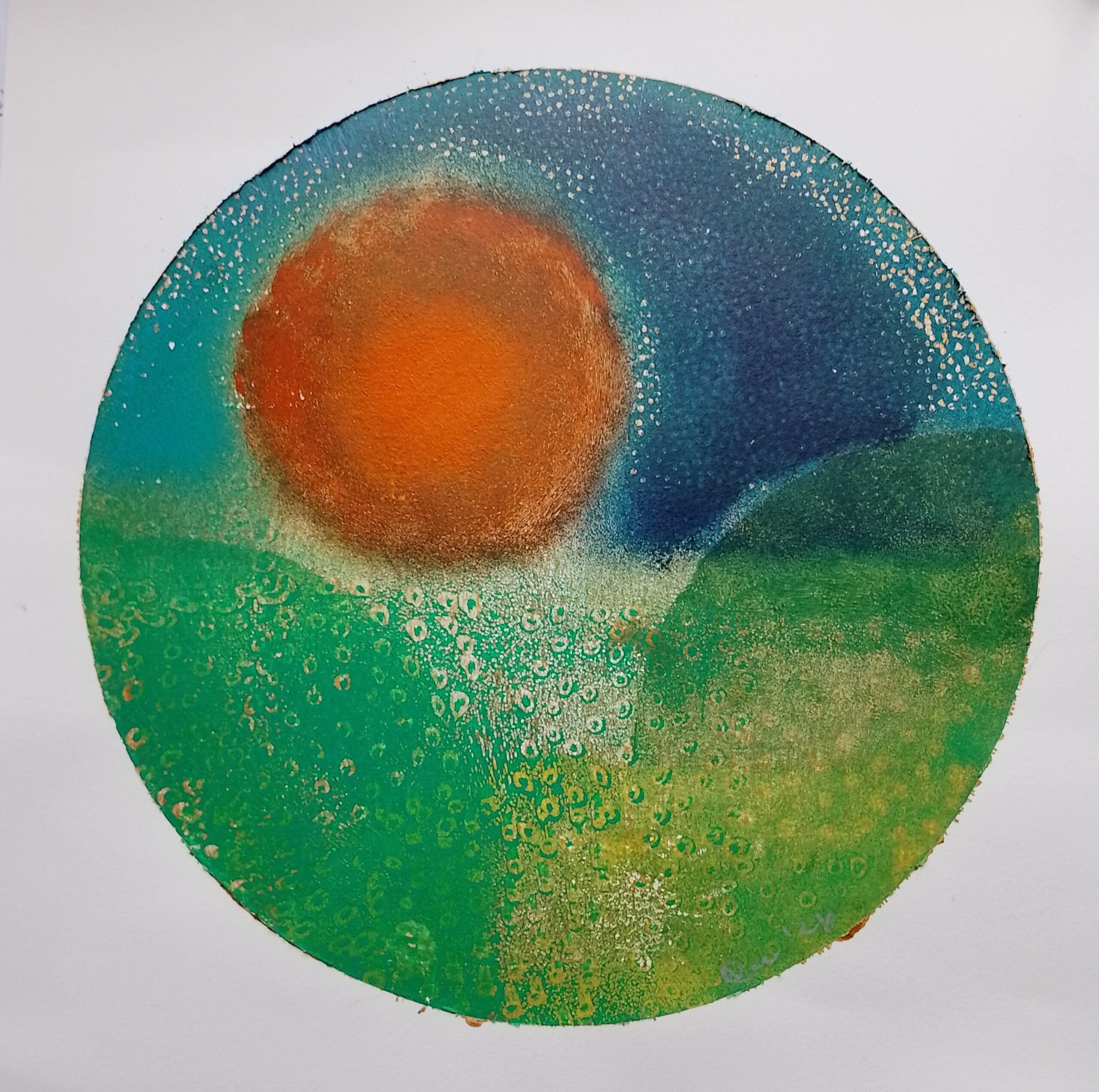 An abstract landscape dominated by an orange sphere, perhaps a setting sun or harvest moon, over green landscape, an image inspired by calmness and hope for a better tomorrow. The image is a 8″ round monoprint using acrylics on paper. It ships unframed.