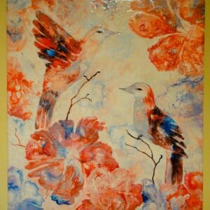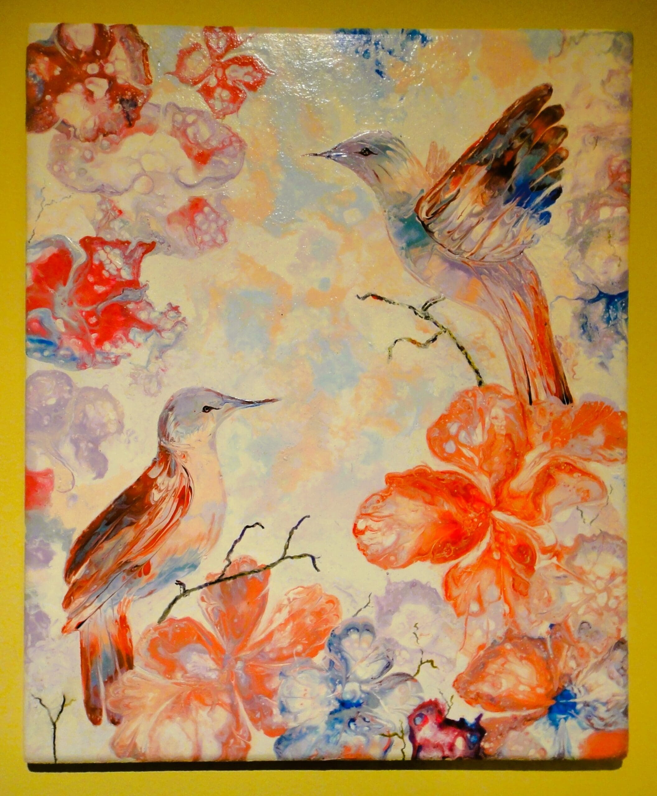 Acrylic Abstract Art, featuring Humming birds among Flowers. One of a matching pair. Painted in acrylics by : Anthony Mordaunt. Clonmel, Co. Tipperary.