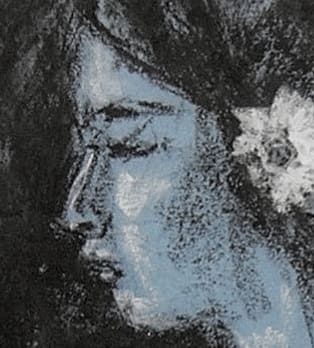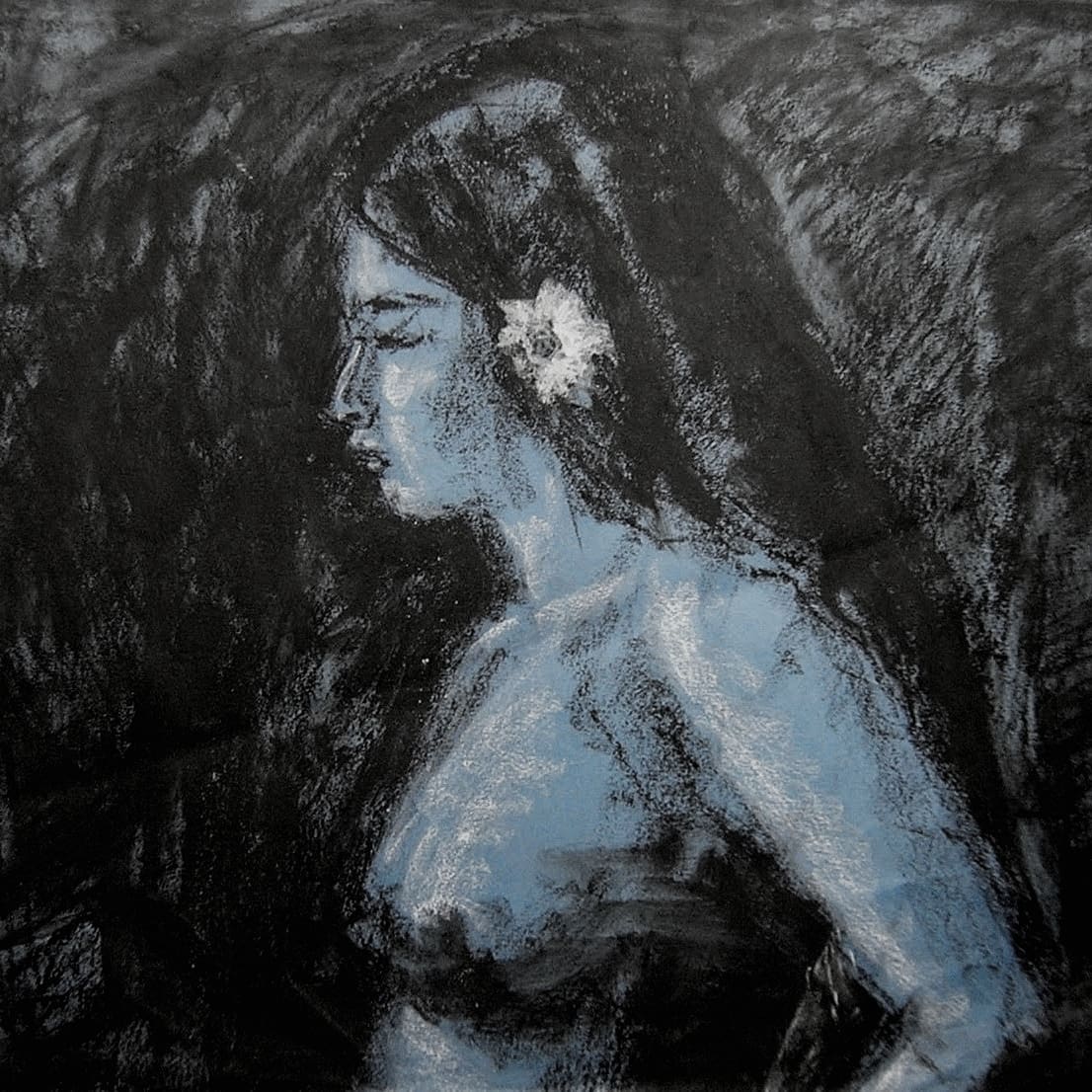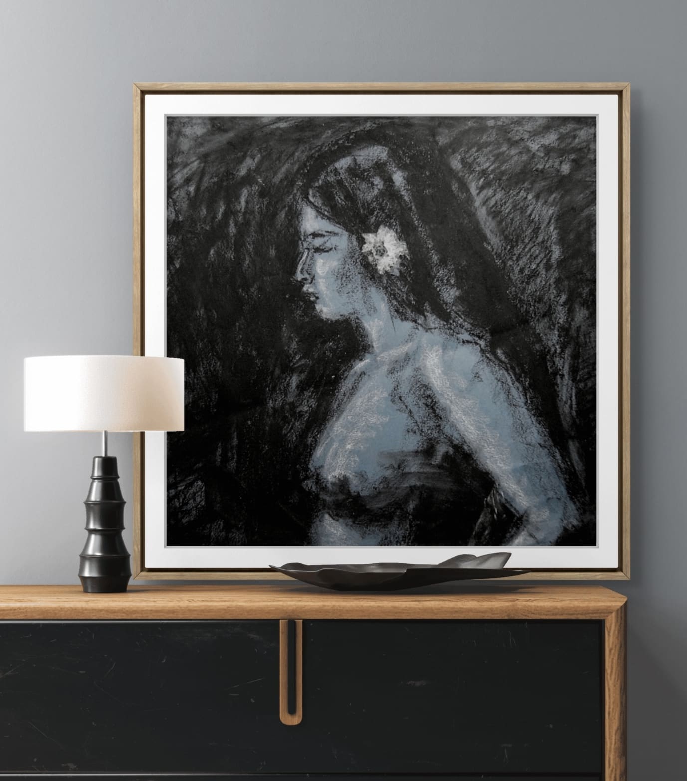 Kashet’s Profile in Twilight captures a quiet, intimate moment in a single hour of focused creation. The figure, shown in soft monochrome tones against a deep, shadowy background, brings forward the delicate balance between light and darkness. Kashet’s long hair, marked by a simple flower tucked behind her ear, contrasts gently with the smooth, glowing highlights on her face and shoulder. The textured strokes, energized yet thoughtful, trace the contours with an attentive hand, emphasizing the quiet strength and calm presence of the sitter. This edition of only ten giclée prints retains an unmistakable sense of immediacy, where the subtle blending of oil pastel and thinned terpentine adds a painterly softness reminiscent of an oil wash, lending both depth and intimacy to this modest but compelling portrait.