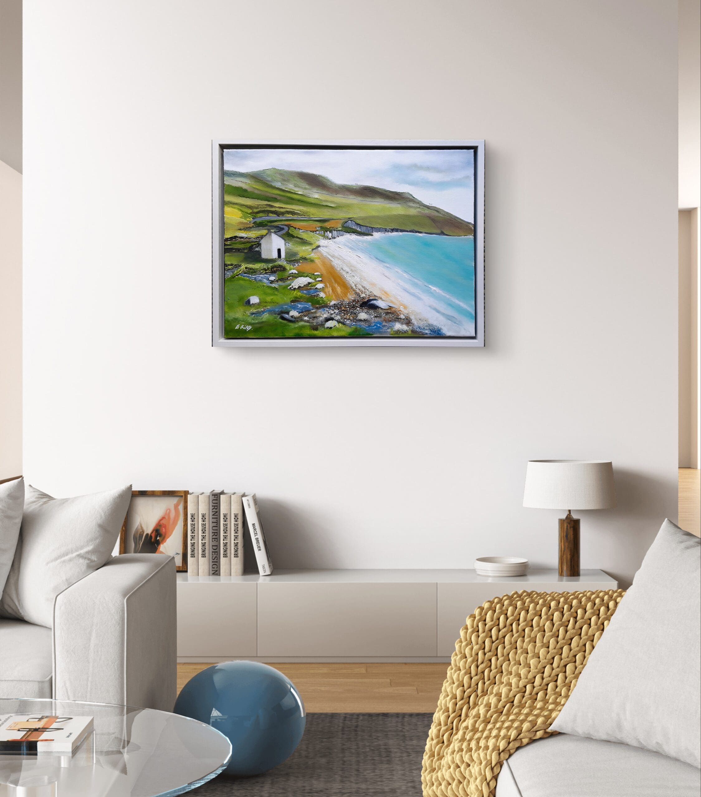 Original oil on canvas. The beautiful Keem bay situated along the Wild Atlantic way on Achill Island in Co. Mayo. I have painted Keem several times in many different seasons. This is a summer scene showing off the gorgeous sandy beach and clear waters reflecting turquoise bluey waters. Framed in a light weight floater style with a grain in a off white.