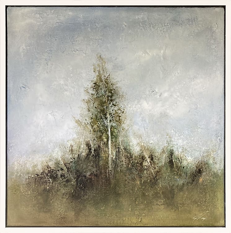 Textured abstract painting, employing a subdued colour palette of greens and browns resulting in a relaxing, calm piece. Framed and ready to hang.