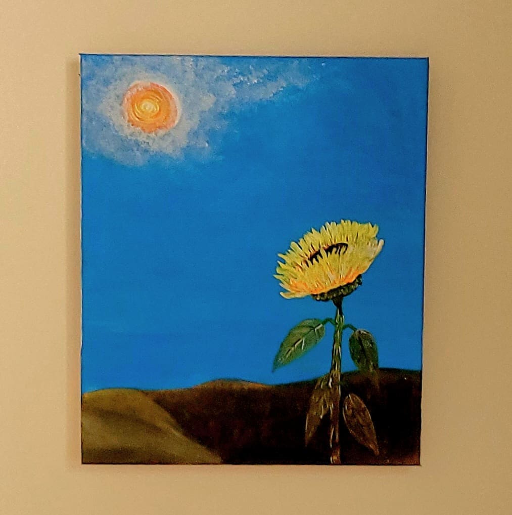 Painting on stretched canvas frame measuring 50cm x 40cm capturing the almost spiritual connection between nature and our sun in a semi surreal style