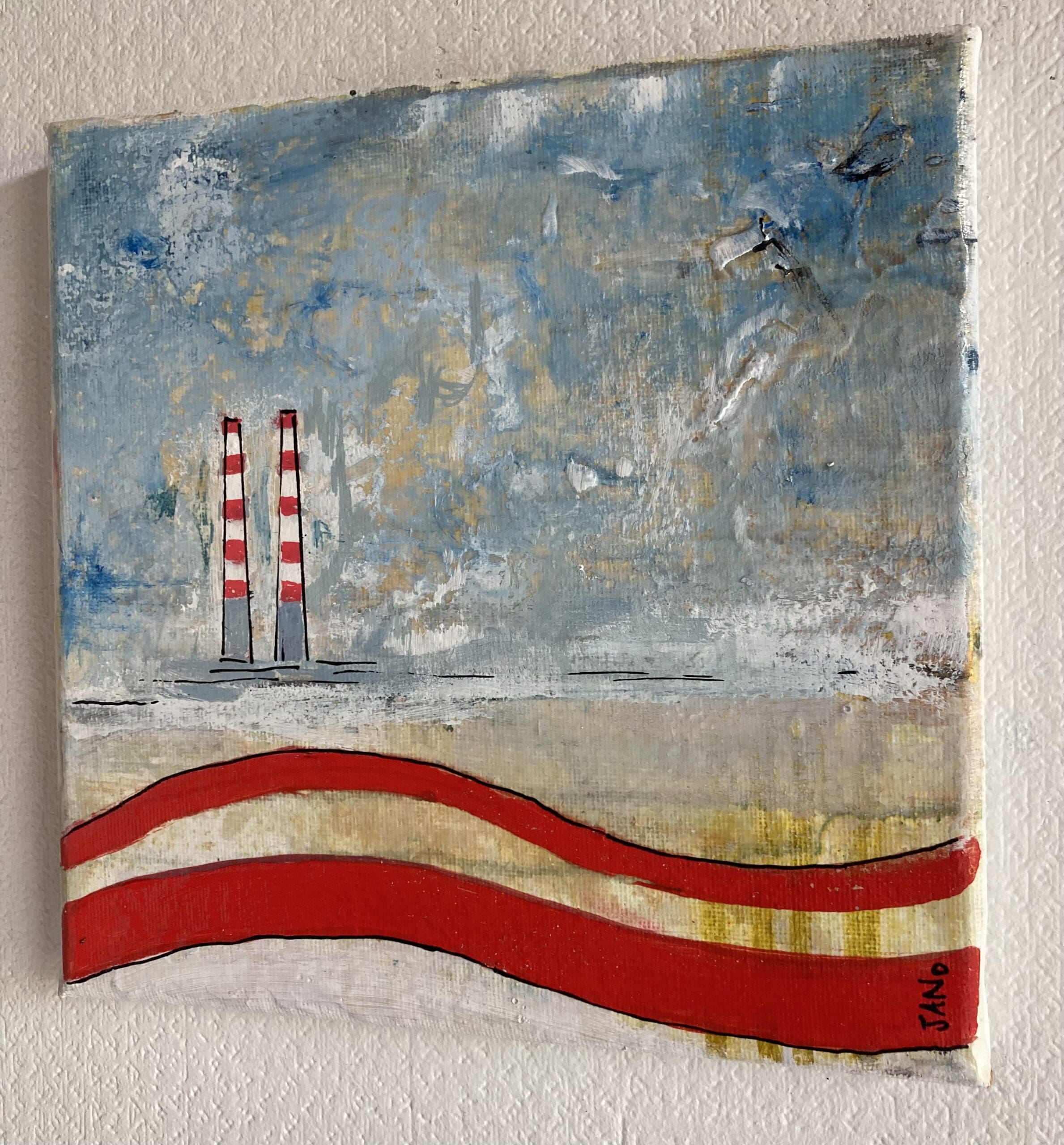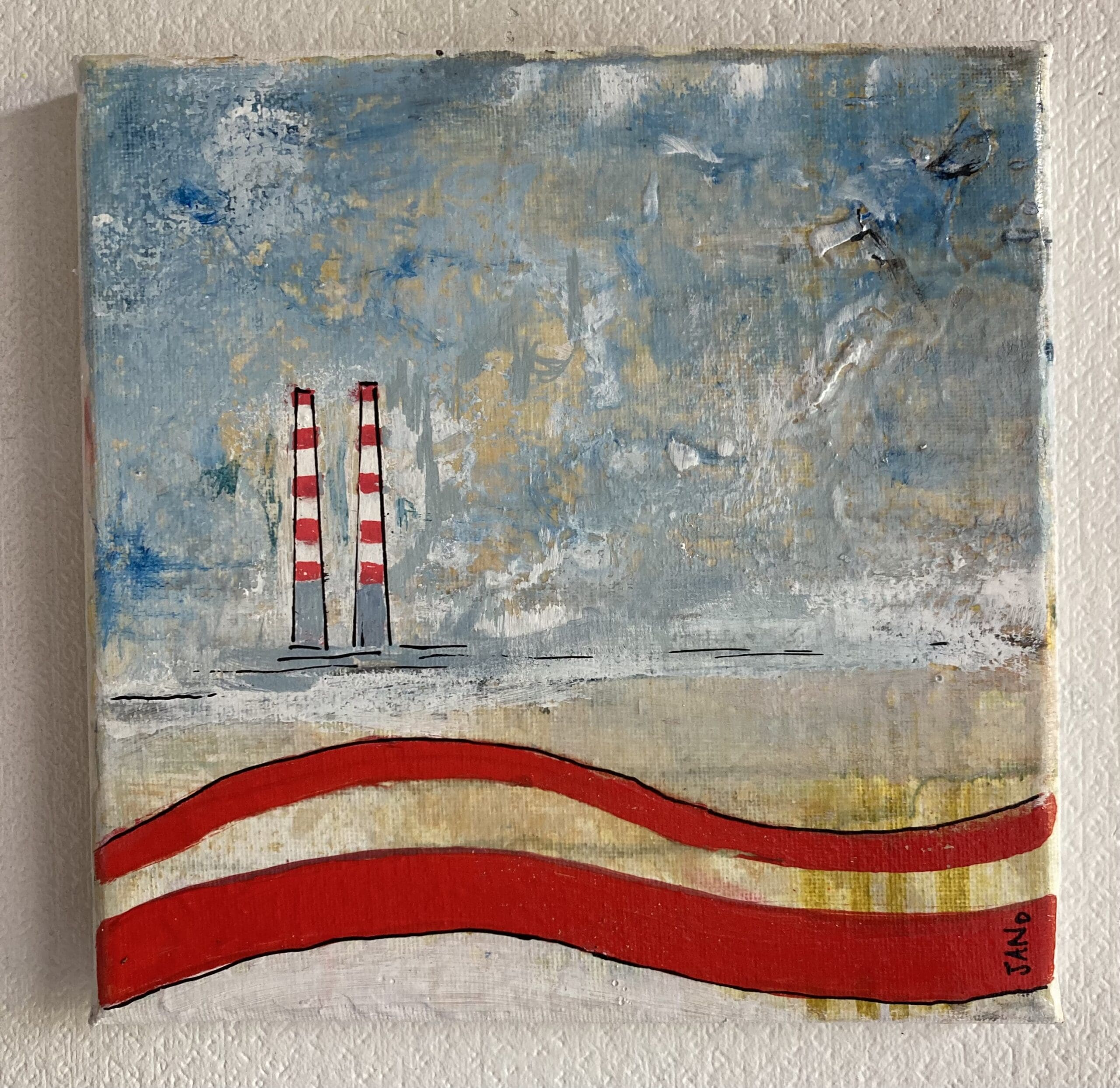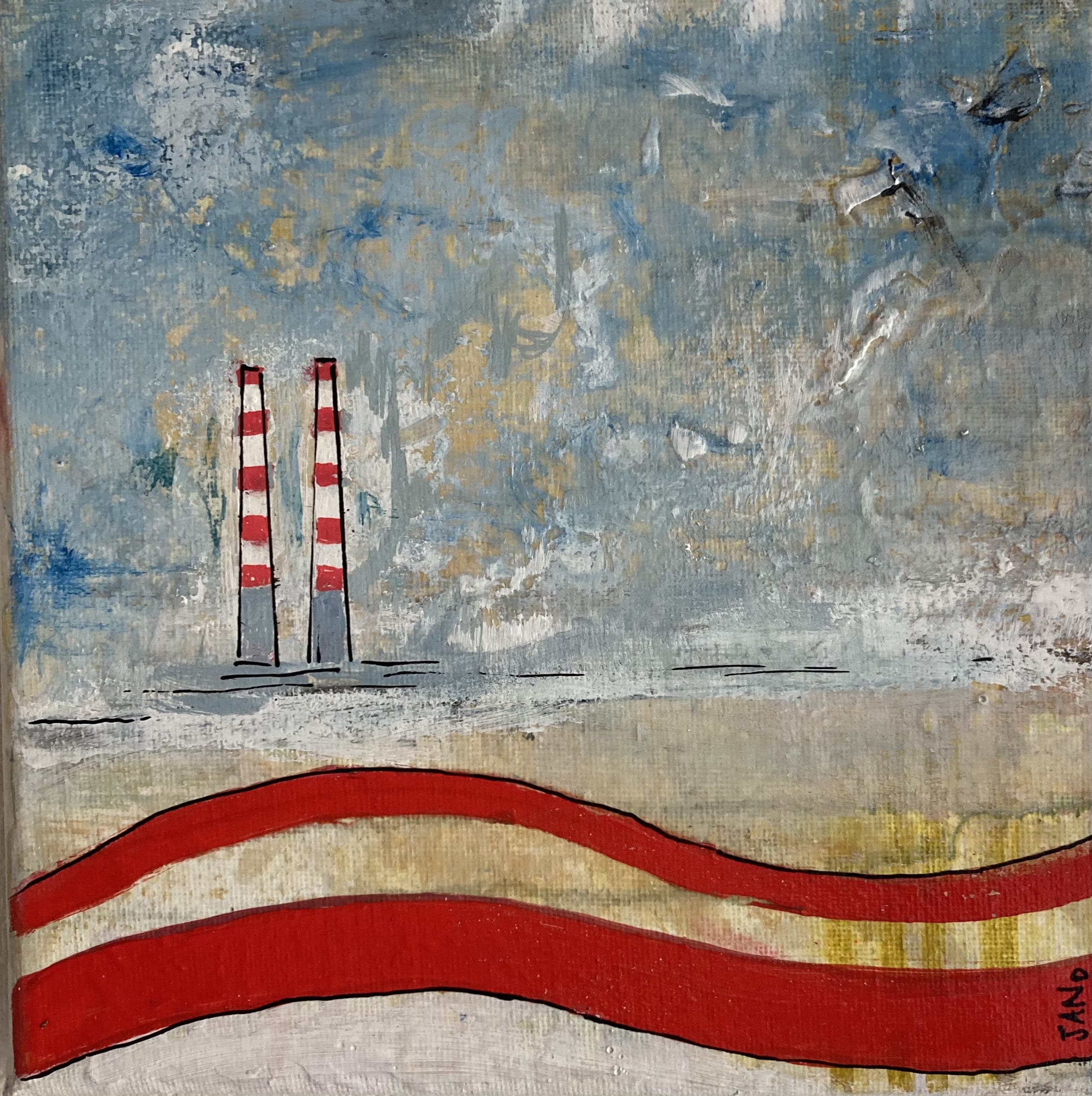 Contemporary abstract artwork featuring the iconic Poolbeg chimneys in a traditional seaside colour palette.