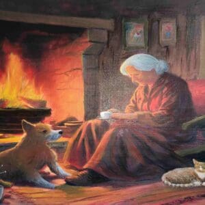 This painting portrays a man guiding a white horse beside a wooden harrow, through a sunlit wheat field while seagulls wheel overhead. Warm golds sit against a deep, cool sky; light and shadow shape the figures and suggest a passing breeze. Energetic brushwork and layered paint give the scene a tactile, luminous surface that highlights the horse’s coat and the field’s grain. The composition emphasizes the companionable rhythm of rural labor and quiet resilience. A quietly confident piece that will enhance a living room, study, or hallway with a touch of nature and steadiness.
