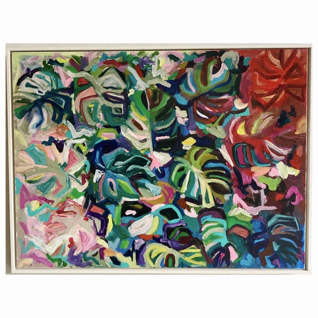 Large botanical in abstract for your large space. This full on monstera leaf artwork has paint texture and depth, and is newly framed in a 5cm deep edge white limed wooden frame.