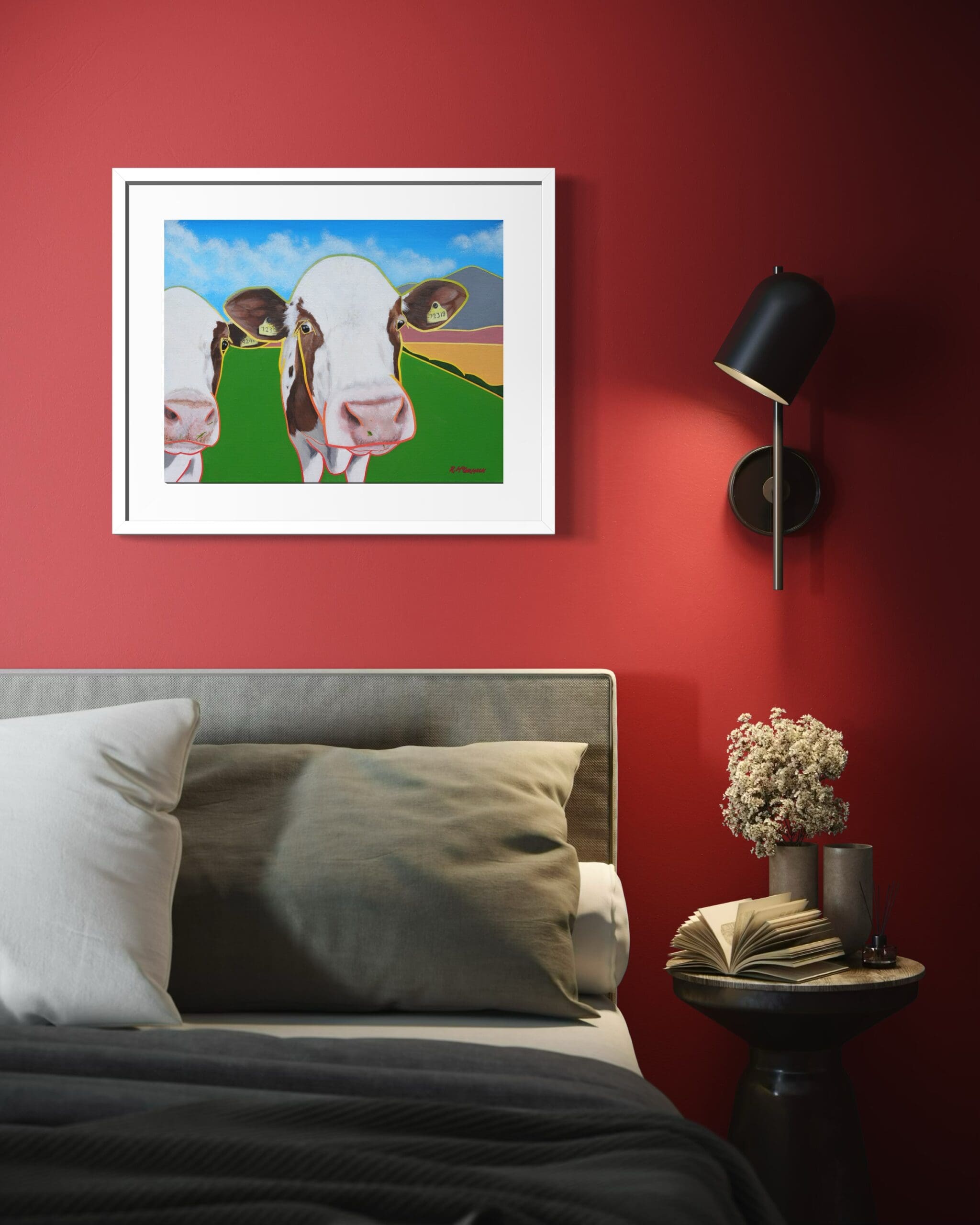 A different take on rural life, Moove Over brings the viewer right into the cows’ space, offering a glimpse of their personalities as they look directly out of the frame. Painted in Rob’s Hidden Light style the bold outlines and saturated colours give the scene a modern edge, turning a familiar moment from the field into a confident, graphic statement.