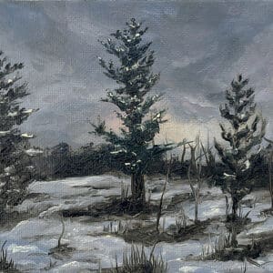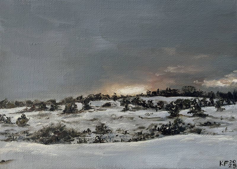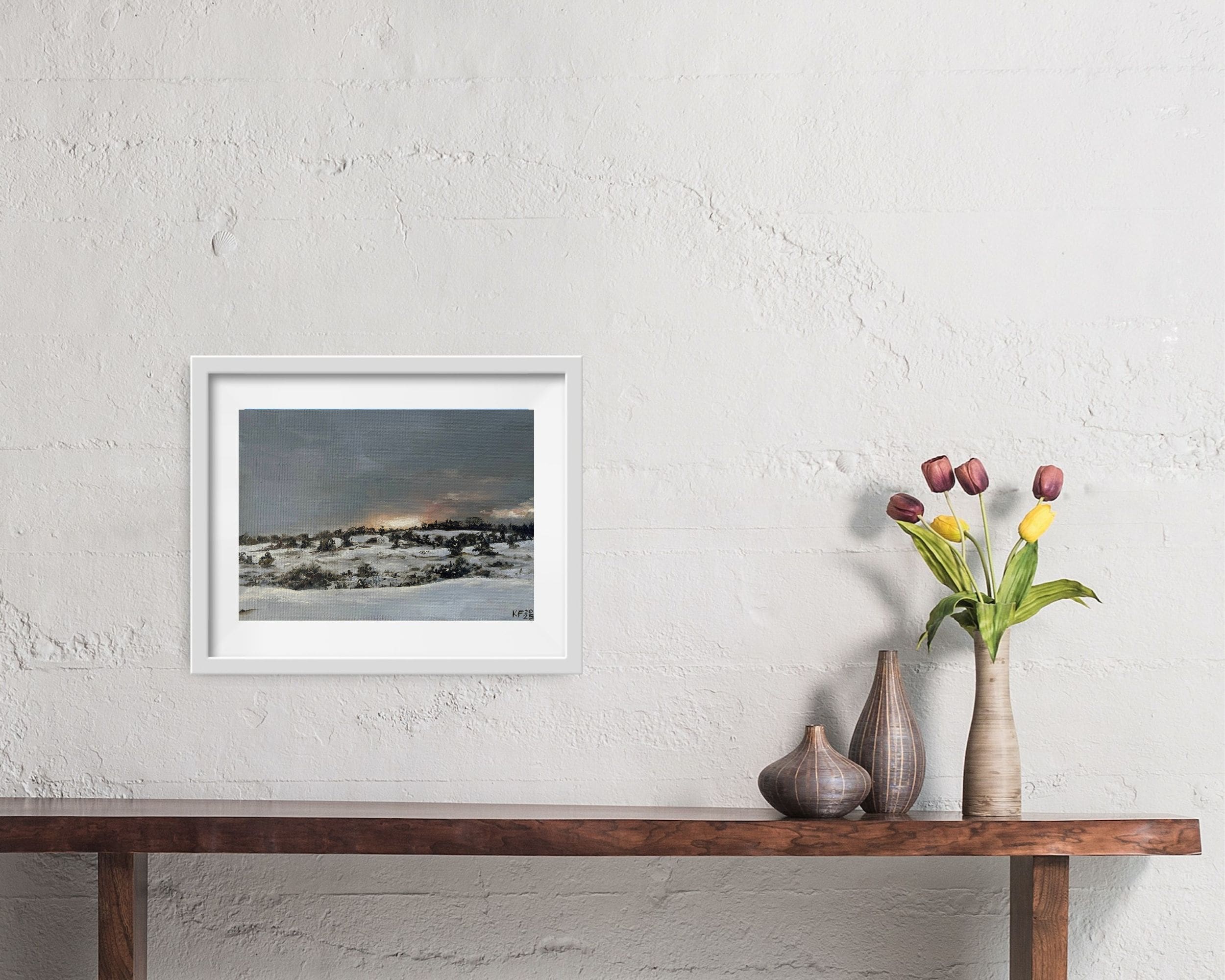 Original oil painting on canvas board by Karina Fleming showing beautiful hill landscape with snow with rising sun